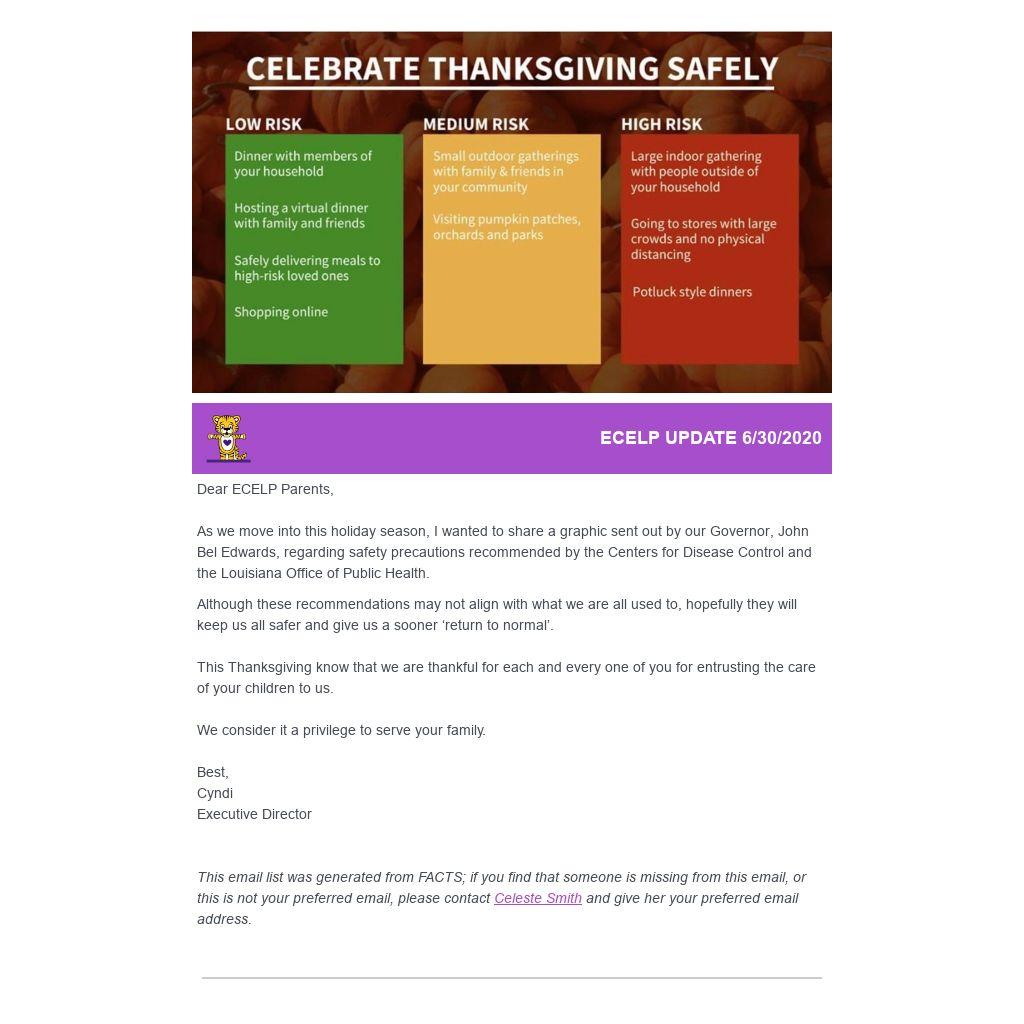 As we move into this holiday season, I wanted to share a graphic sent out by our Governor, John Bel Edwards, regarding safety precautions recommended by the Centers for Disease Control and the Louisiana Office of Public Health.