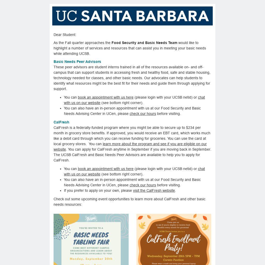 We want all students to thrive in and out of the classroom, and we encourage you to use these resources. To learn more about additional basic needs resources at UCSB please visit food.ucsb.edu.