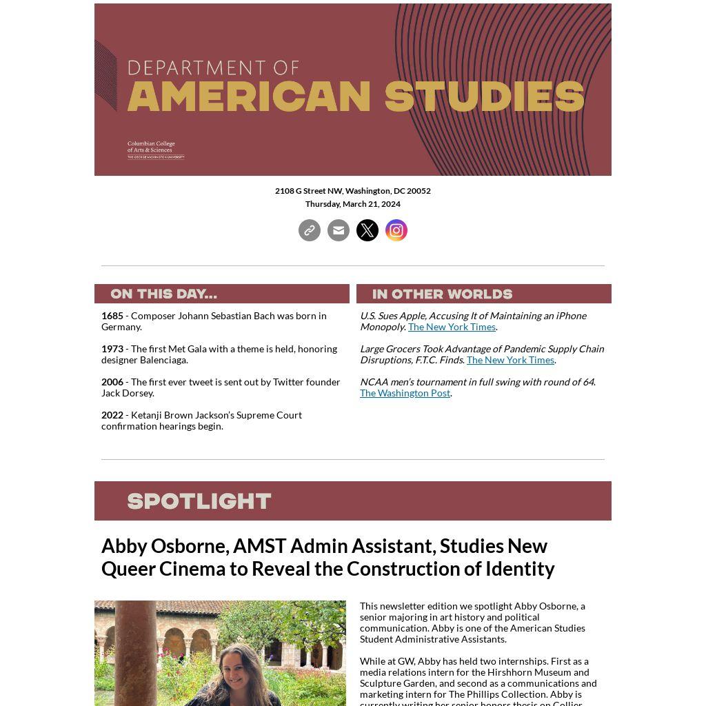 | This newsletter edition we spotlight Abby Osborne, a senior majoring in art history and political communication. Abby is one of the American Studies Student Administrative Assistants.