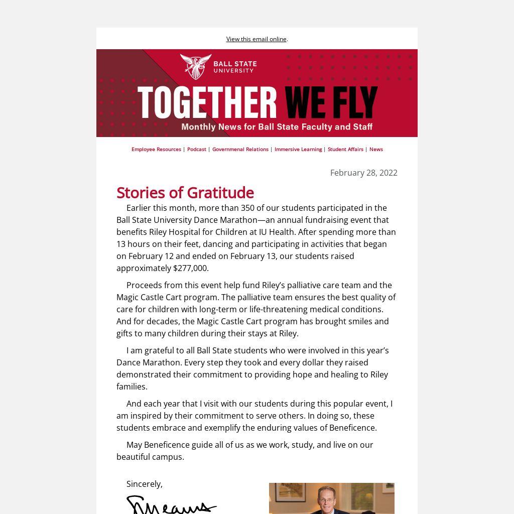 I am grateful to all Ball State students who were involved in this year’s Dance Marathon. Every step they took and every dollar they raised demonstrated their commitment to providing hope and healing to Riley families.