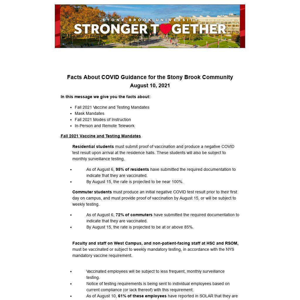 As of August 6, 80% of all registered students have submitted proof of vaccination. With upcoming deadlines for commuter students to submit documentation, this rate is expected to rise.