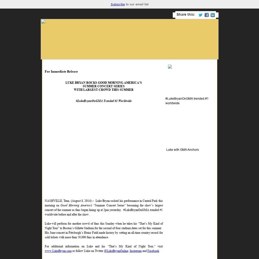 NASHVILLE, Tenn. (August 8, 2014) – Luke Bryan rocked his performance in Central Park this morning on Good Morning America’s “Summer Concert Series” becoming the show’s largest concert of the summer as fans began lining up at 2pm yesterday. #LukeBryanOnGMA trended #1 worldwide before and after the show.