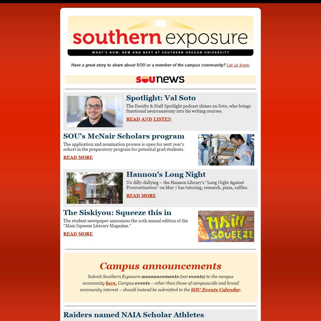 Submit Southern Exposure announcements (not events) to the campus community here. Campus events – other than those of campuswide and broad community interest – should instead be submitted to the SOU Events Calendar.