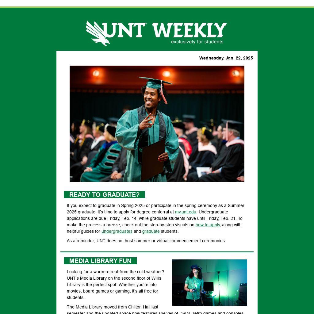 If you expect to graduate in Spring 2025 or participate in the spring ceremony as a Summer 2025 graduate, it’s time to apply for degree conferral at my.unt.edu. Undergraduate applications are due Friday, Feb. 14, while graduate students have until Friday, Feb. 21. To make the process a breeze, check out the step-by-step visuals on how to apply, along with helpful guides for undergraduates and graduate students.