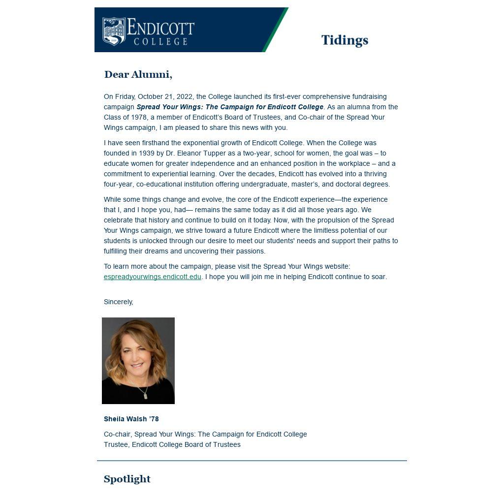 On Friday, October 21, 2022, the College launched its first-ever comprehensive fundraising campaign Spread Your Wings: The Campaign for Endicott College. As an alumna from the Class of 1978, a member of Endicott’s Board of Trustees, and Co-chair of the Spread Your Wings campaign, I am pleased to share this news with you.