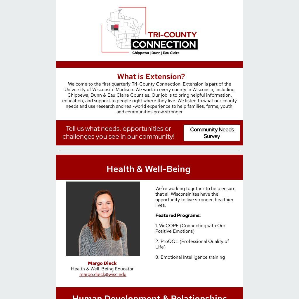 Welcome to the first quarterly Tri-County Connection! Extension is part of the University of Wisconsin–Madison. We work in every county in Wisconsin, including Chippewa, Dunn & Eau Claire Counties. Our job is to bring helpful information, education, and support to people right where they live. We listen to what our county needs and use research and real-world experience to help families, farms, youth, and communities grow stronger