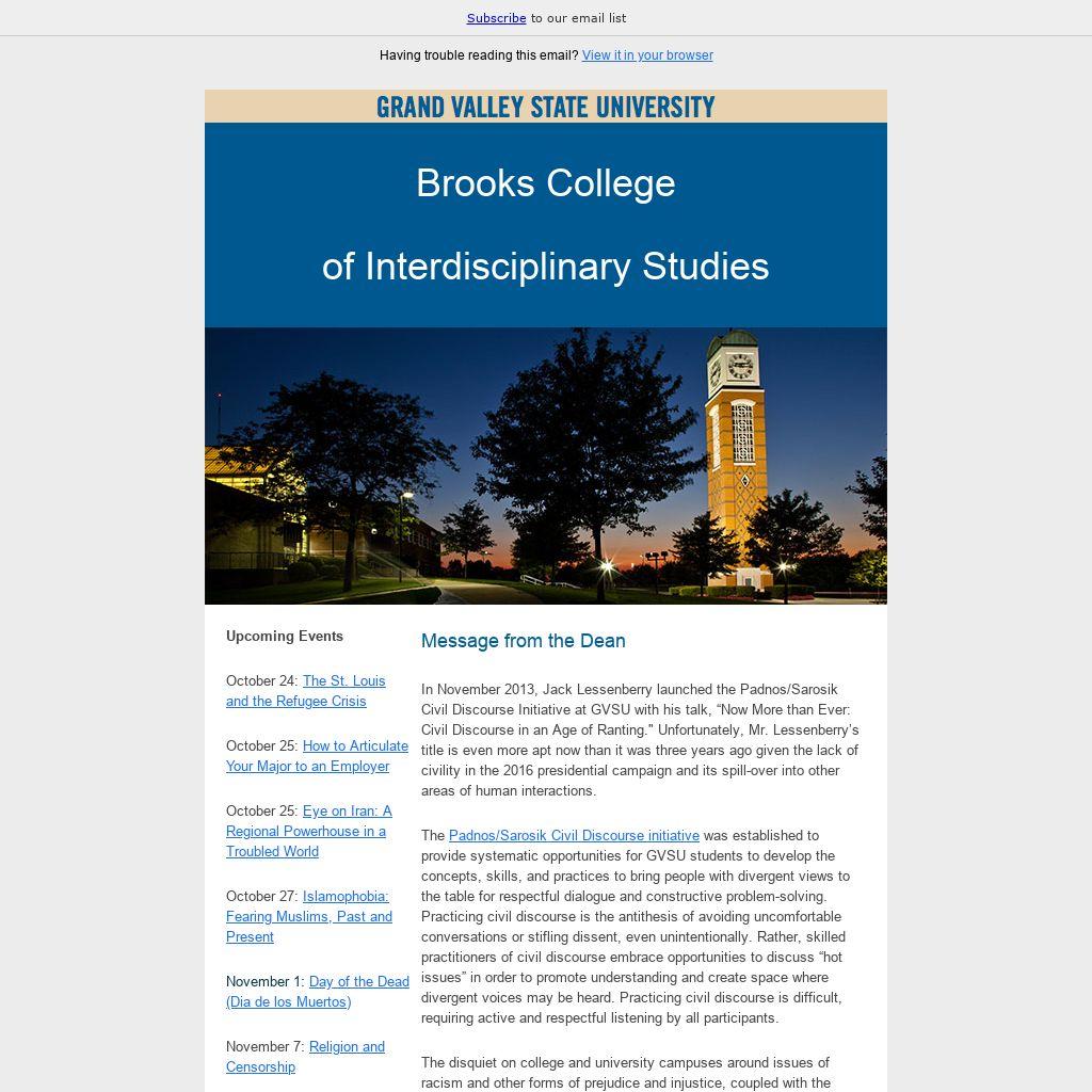 - Thursday, November 10, 5:00 – 8:30 p.m., Eberhard Center (2nd floor): All Grand Valley faculty, staff, and students are encouraged to attend the 3rd Annual Padnos/Sarosik Civil Discourse Symposium, “Welcoming Immigrants and Refugees: Community Engagement and Transformation."