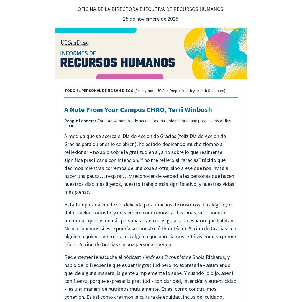 Tengo una profunda gratitud por la comunidad de UC San Diego: por su resiliencia, su generosidad, su compasión, y las innumerables maneras en que se acompañan unos a otros. Ustedes me inspiran cada día, y no doy por sentado el privilegio de servir junto a ustedes.