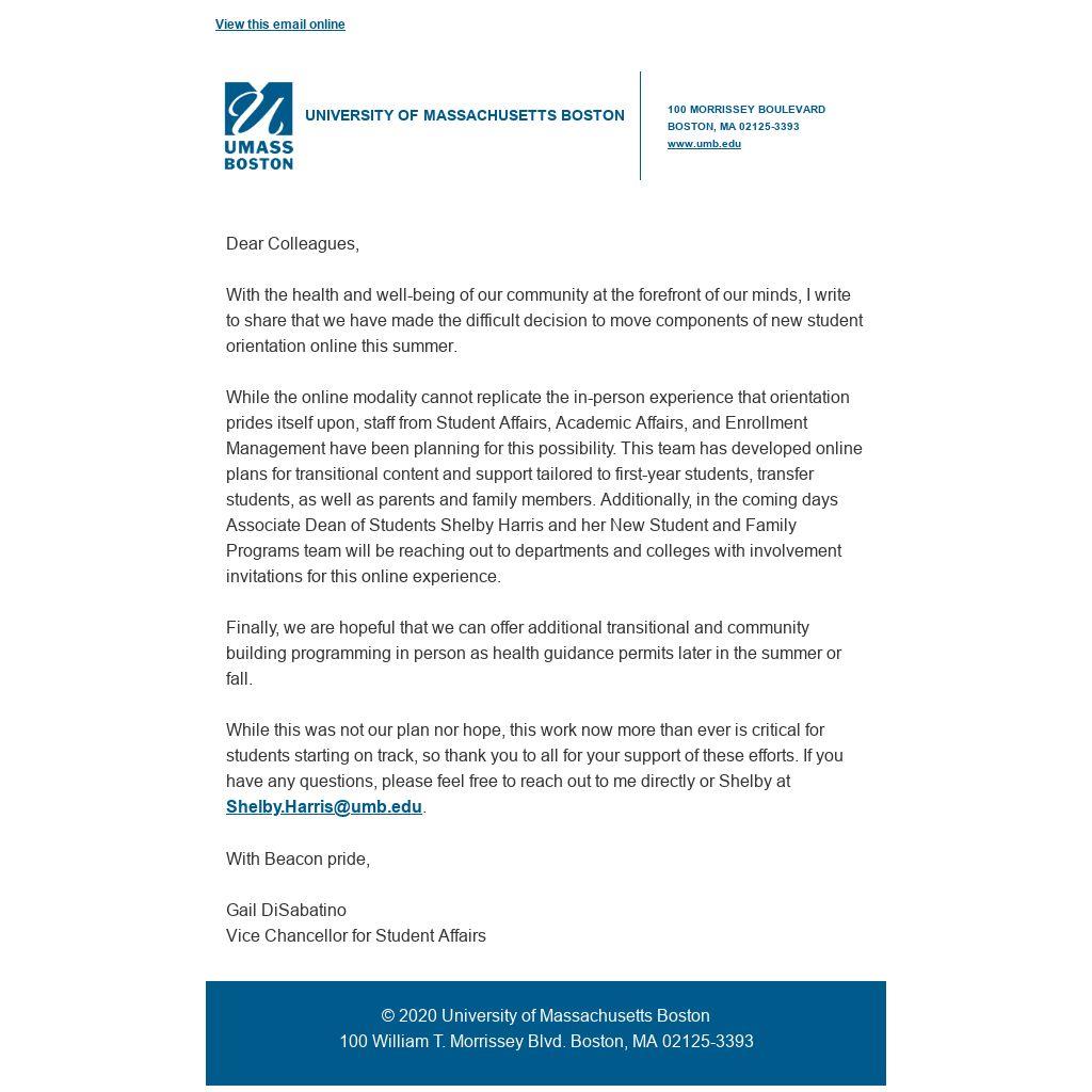 With the health and well-being of our community at the forefront of our minds, I write to share that we have made the difficult decision to move components of new student orientation online this summer.