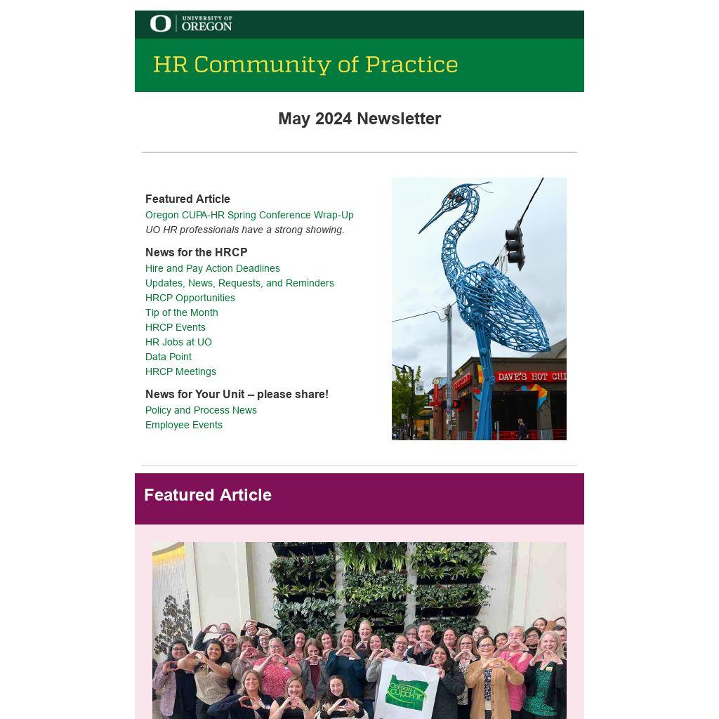 Outstanding Employee Awards celebration: May 22, 1:30 to 3:00 p.m., Giustina Ballroom, Ford Alumni Center. HR partners, especially those with 2024 awardees in their units, are invited to attend this celebration of the winners and the UO's employee community.