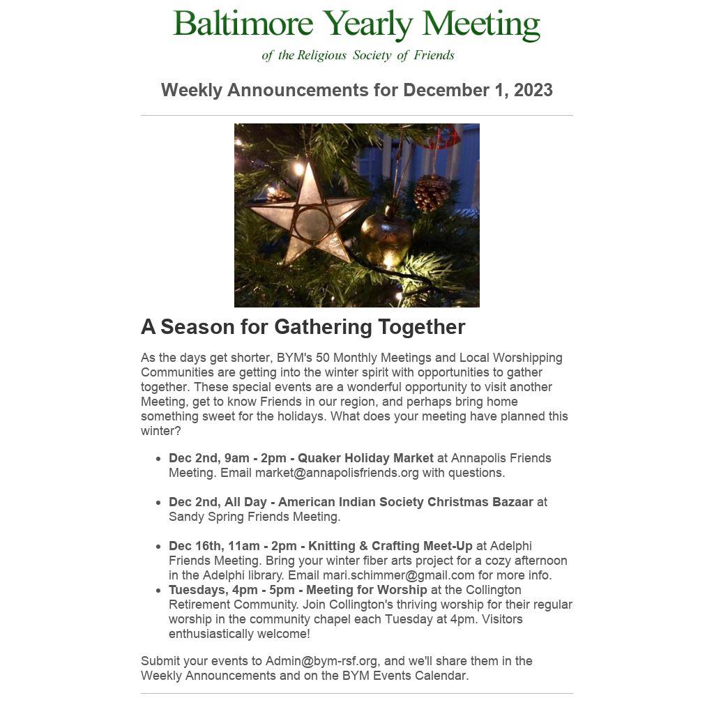 Dec 2nd, 9am - 2pm - Quaker Holiday Market at Annapolis Friends Meeting. Email market@annapolisfriends.org with questions.