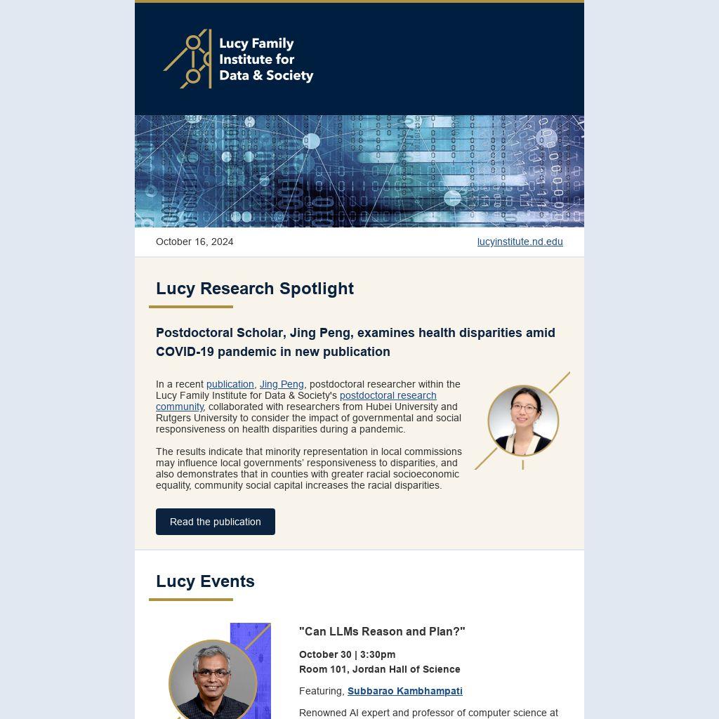 In a recent publication, Jing Peng, postdoctoral researcher within the Lucy Family Institute for Data & Society's postdoctoral research community, collaborated with researchers from Hubei University and Rutgers University to consider the impact of governmental and social responsiveness on health disparities during a pandemic.