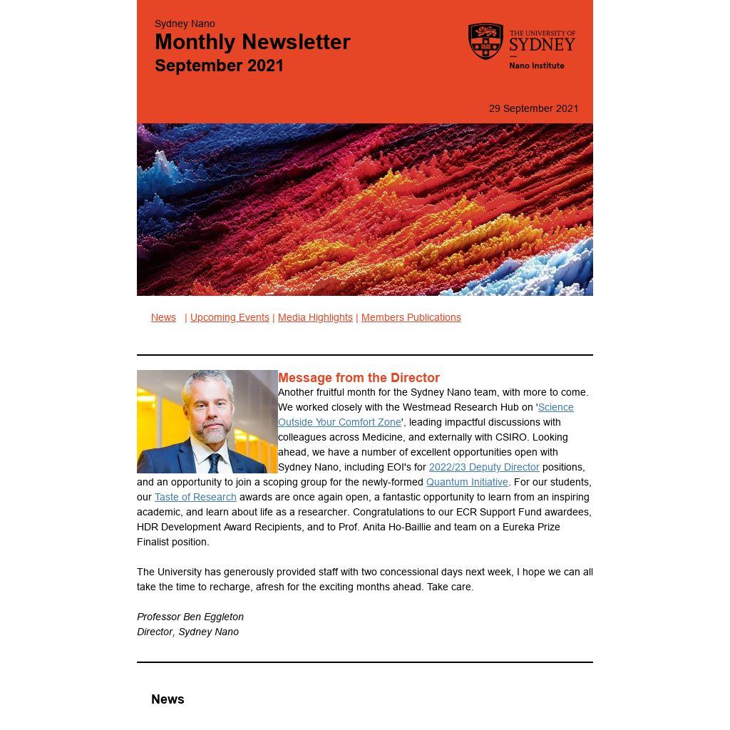 Message from the DirectorAnother fruitful month for the Sydney Nano team, with more to come. We worked closely with the Westmead Research Hub on ' Science Outside Your Comfort Zone', leading impactful discussions with colleagues across Medicine, and externally with CSIRO. Looking ahead, we have a number of excellent opportunities open with Sydney Nano, including EOI's for 2022/23 Deputy Director positions, and an opportunity to join a scoping group for the newly-formed Quantum Initiative. For our students, our Taste of Research awards are once again open, a fantastic opportunity to learn from an inspiring academic, and learn about life as a researcher. Congratulations to our ECR Support Fund awardees, HDR Development Award Recipients, and to Prof. Anita Ho-Baillie and team on a Eureka Prize Finalist position.