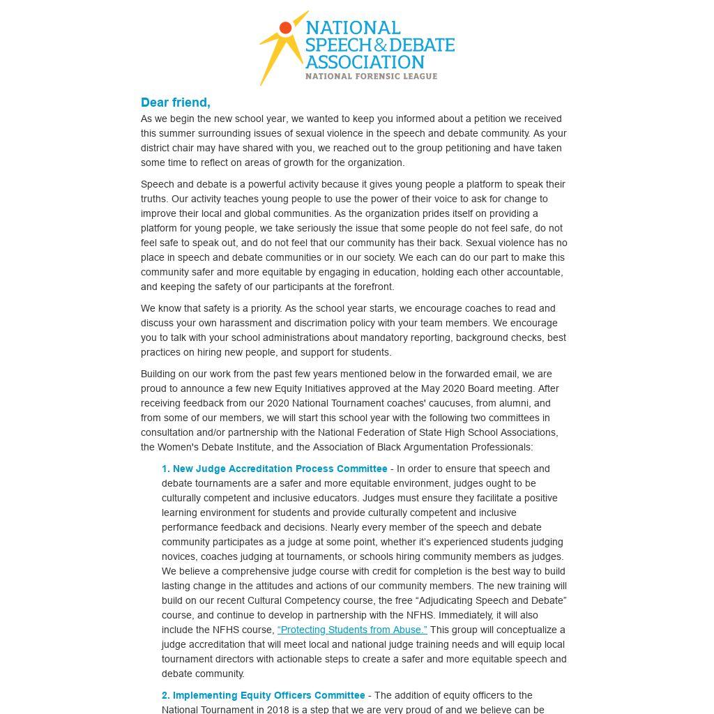 As we begin the new school year, we wanted to keep you informed about a petition we received this summer surrounding issues of sexual violence in the speech and debate community. As your district chair may have shared with you, we reached out to the group petitioning and have taken some time to reflect on areas of growth for the organization.