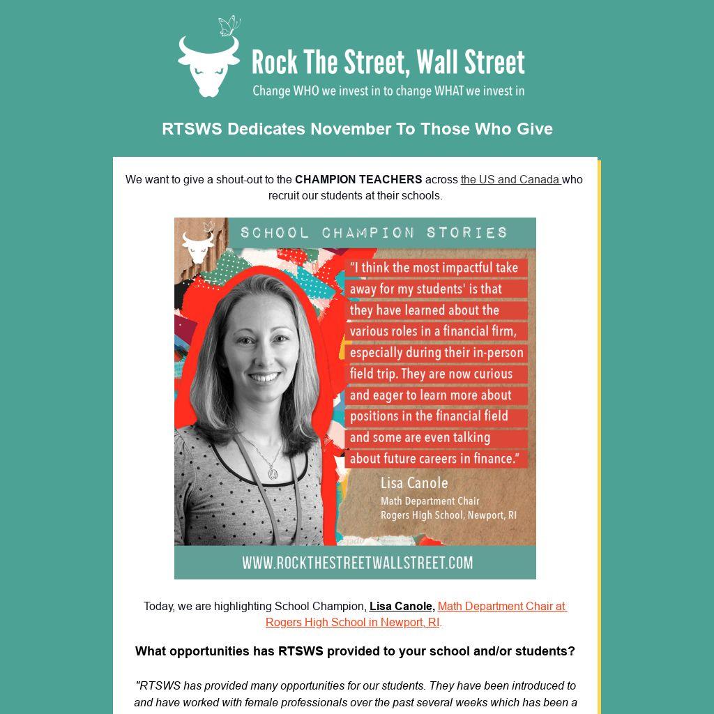 "RTSWS has provided many opportunities for our students. They have been introduced to and have worked with female professionals over the past several weeks which has been a great experience in itself. In working with these women, students have learned about the roles these women have at Havener Capital, which has opened their eyes to job opportunities in the financial industry. They have also learned about budgeting, saving and investing which provides them the knowledge to be financially literate."