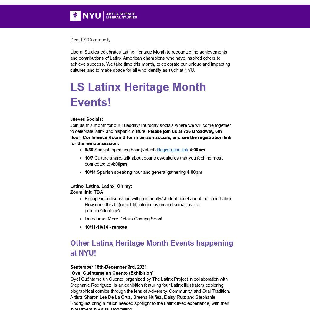 Liberal Studies celebrates Latinx Heritage Month to recognize the achievements and contributions of Latinx American champions who have inspired others to achieve success. We take time this month, to celebrate our unique and impacting cultures and to make space for all who identify as such at NYU.
