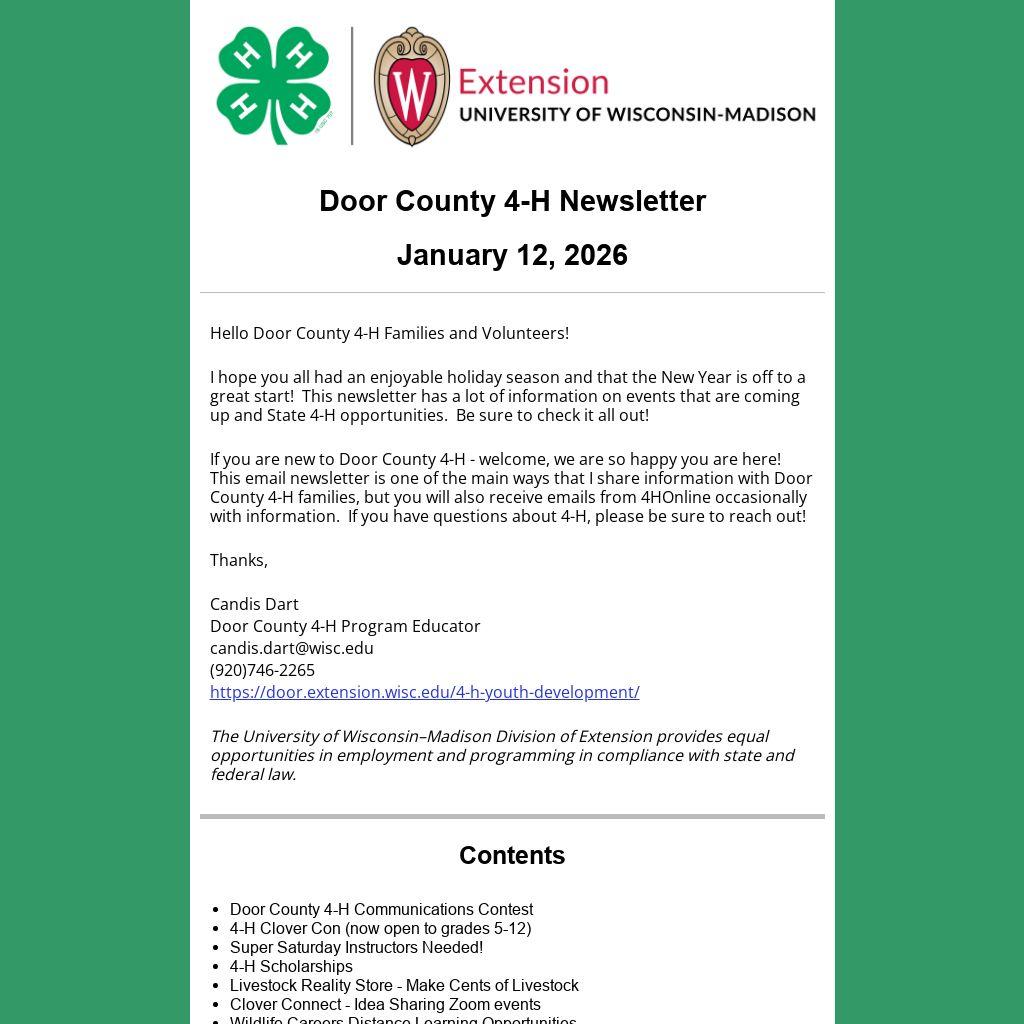 If you are new to Door County 4-H - welcome, we are so happy you are here! This email newsletter is one of the main ways that I share information with Door County 4-H families, but you will also receive emails from 4HOnline occasionally with information. If you have questions about 4-H, please be sure to reach out!