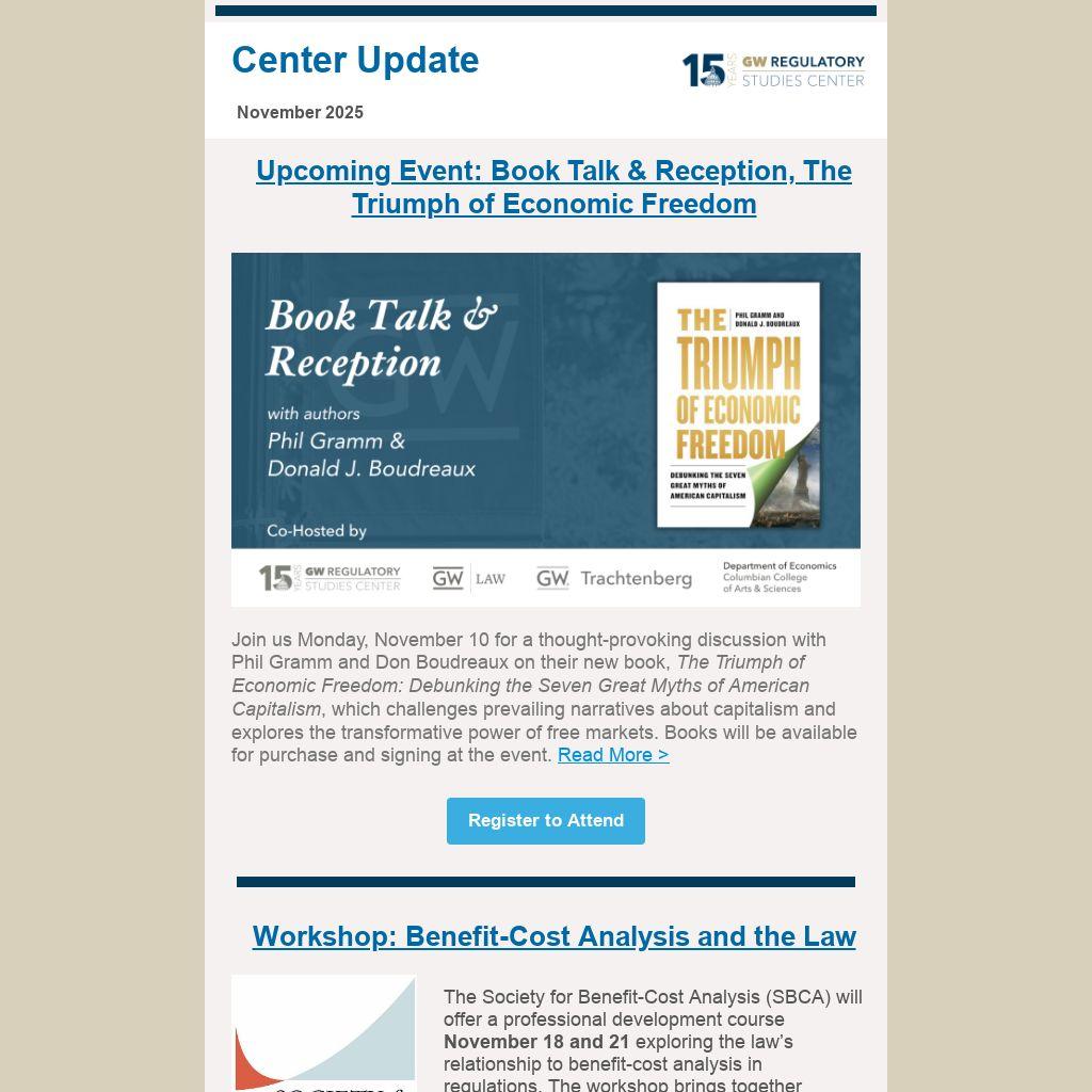 Join us Monday, November 10 for a thought-provoking discussion with Phil Gramm and Don Boudreaux on their new book, The Triumph of Economic Freedom: Debunking the Seven Great Myths of American Capitalism, which challenges prevailing narratives about capitalism and explores the transformative power of free markets. Books will be available for purchase and signing at the event. Read More >
