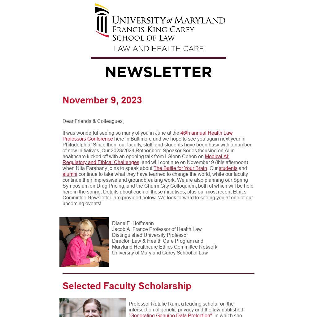 It was wonderful seeing so many of you in June at the 46th annual Health Law Professors Conference here in Baltimore and we hope to see you again next year in Philadelphia! Since then, our faculty, staff, and students have been busy with a number of new initiatives. Our 2023/2024 Rothenberg Speaker Series focusing on AI in healthcare kicked off with an opening talk from I Glenn Cohen on Medical AI: Regulatory and Ethical Challenges, and will continue on November 9 (this afternoon) when Nita Farahany joins to speak about The Battle for Your Brain. Our students and alumni continue to take what they have learned to change the world, while our faculty continue their impressive and groundbreaking work. We are also planning our Spring Symposium on Drug Pricing, and the Charm City Colloquium, both of which will be held here in the spring. Details about each of these initiatives, plus our most recent Ethics Committee Newsletter, are provided below. We look forward to seeing you at one of our upcoming events!