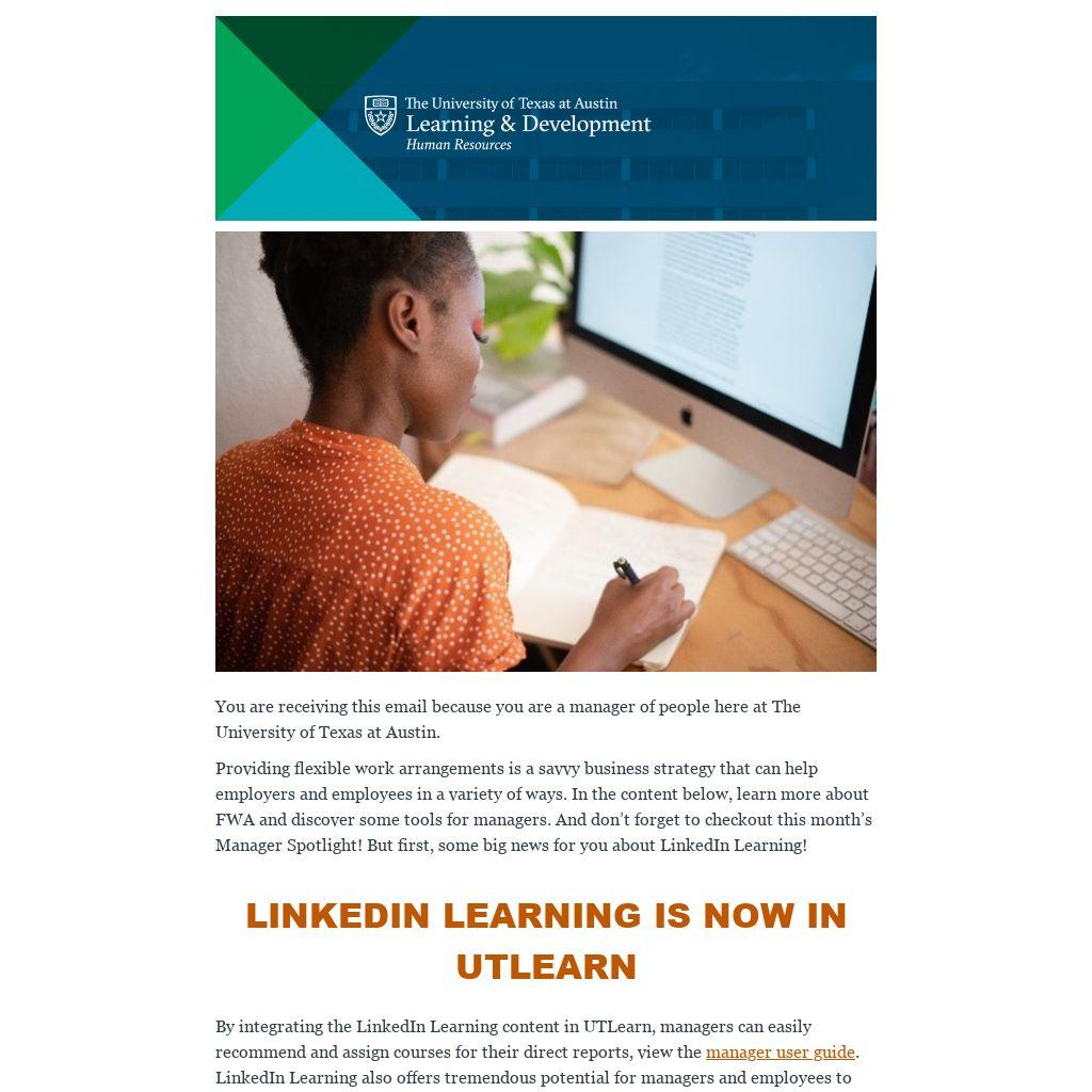 Providing flexible work arrangements is a savvy business strategy that can help employers and employees in a variety of ways. In the content below, learn more about FWA and discover some tools for managers. And don’t forget to checkout this month’s Manager Spotlight! But first, some big news for you about LinkedIn Learning!