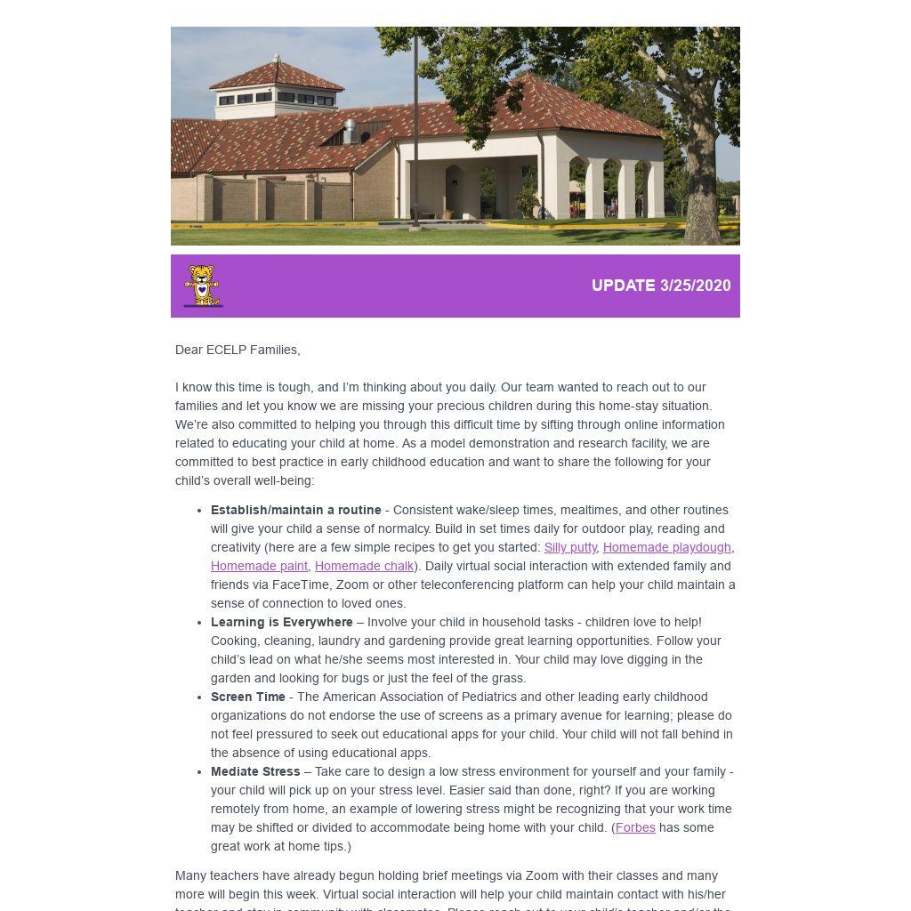 I know this time is tough, and I’m thinking about you daily. Our team wanted to reach out to our families and let you know we are missing your precious children during this home-stay situation. We’re also committed to helping you through this difficult time by sifting through online information related to educating your child at home. As a model demonstration and research facility, we are committed to best practice in early childhood education and want to share the following for your child’s overall well-being: