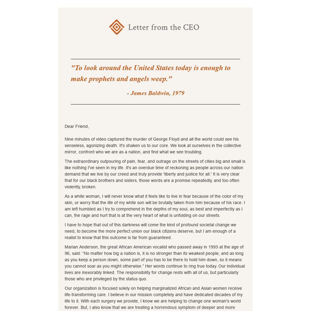 During this unprecedented and challenging time, your enduring compassion and commitment to dramatically improving the lives of women most of us will never meet gives me hope. Now more than ever, a generosity of spirit is needed to make the world a more just, loving, and peaceful place.