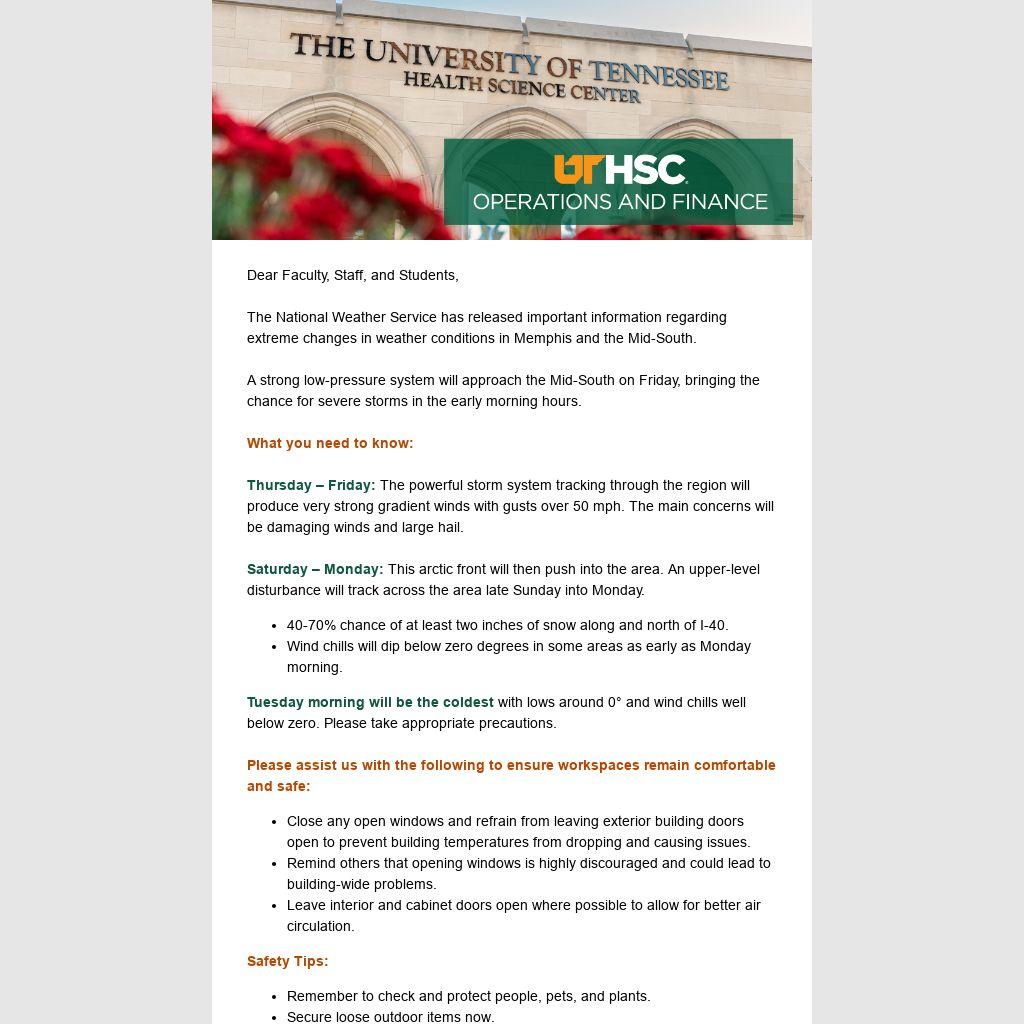 For the latest information, faculty, staff, and students are encouraged to visit the University website at uthsc.edu, and look for messages via UTHSC Alert, our emergency mass messaging system for campus closures.
