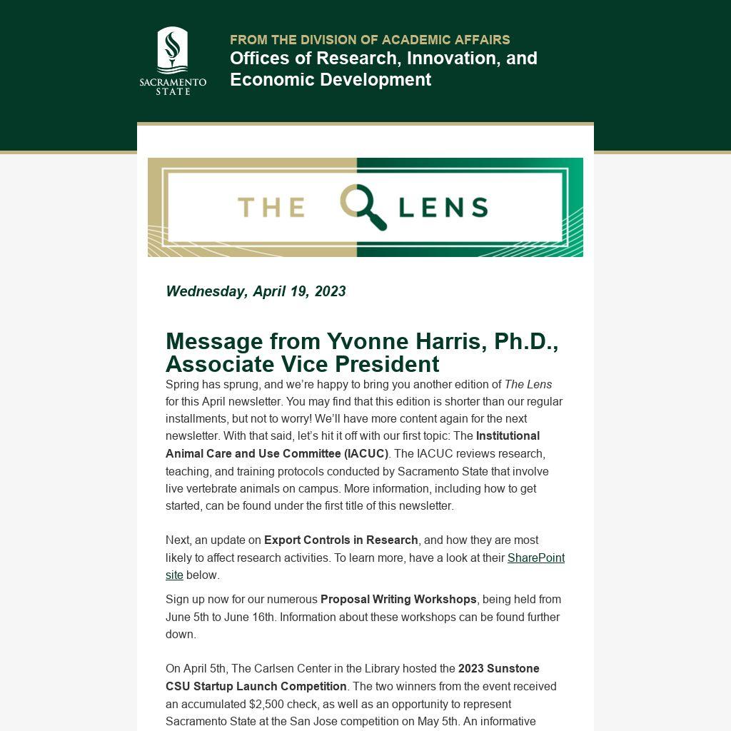 Message from Yvonne Harris, Ph.D., Associate Vice PresidentSpring has sprung, and we’re happy to bring you another edition of The Lens for this April newsletter. You may find that this edition is shorter than our regular installments, but not to worry! We’ll have more content again for the next newsletter. With that said, let’s hit it off with our first topic: The Institutional Animal Care and Use Committee (IACUC). The IACUC reviews research, teaching, and training protocols conducted by Sacramento State that involve live vertebrate animals on campus. More information, including how to get started, can be found under the first title of this newsletter.