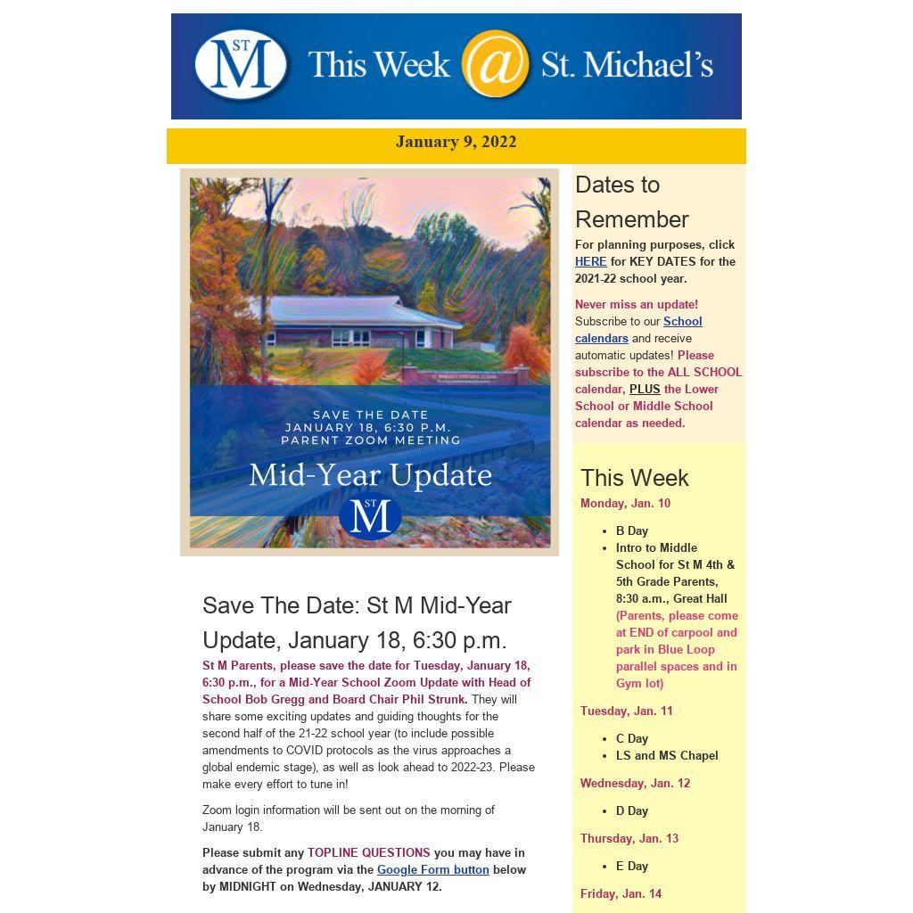 St M Parents, please save the date for Tuesday, January 18, 6:30 p.m., for a Mid-Year School Zoom Update with Head of School Bob Gregg and Board Chair Phil Strunk. They will share some exciting updates and guiding thoughts for the second half of the 21-22 school year (to include possible amendments to COVID protocols as the virus approaches a global endemic stage), as well as look ahead to 2022-23. Please make every effort to tune in!