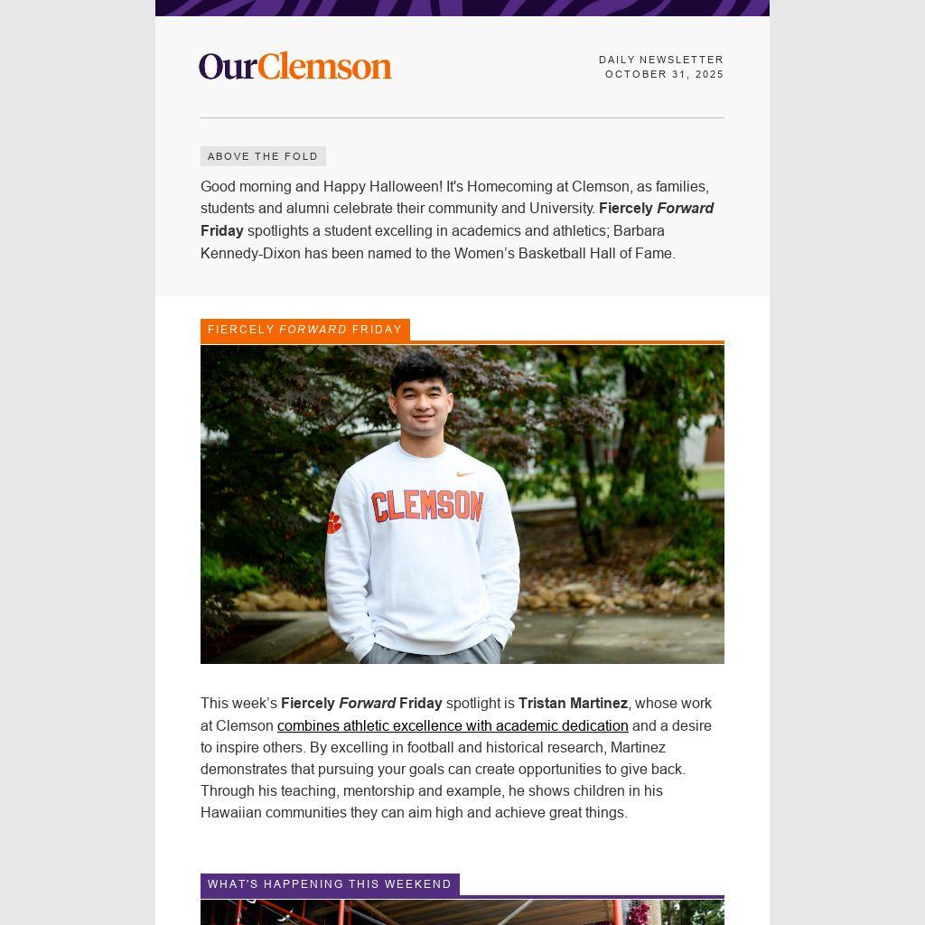 Good morning and Happy Halloween! It's Homecoming at Clemson, as families, students and alumni celebrate their community and University. Fiercely Forward Friday spotlights a student excelling in academics and athletics; Barbara Kennedy-Dixon has been named to the Women’s Basketball Hall of Fame.