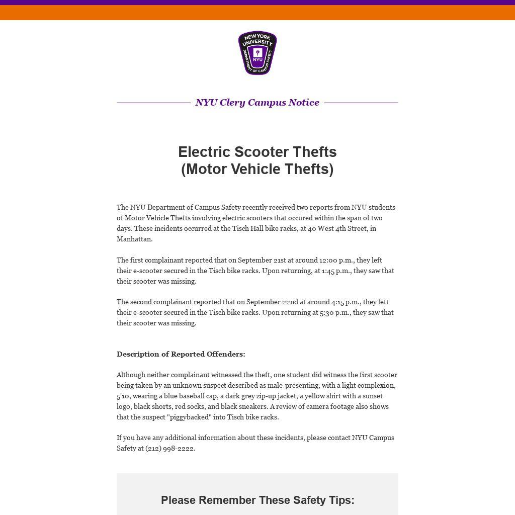 The NYU Department of Campus Safety recently received two reports from NYU students of Motor Vehicle Thefts involving electric scooters that occured within the span of two days. These incidents occurred at the Tisch Hall bike racks, at 40 West 4th Street, in Manhattan.