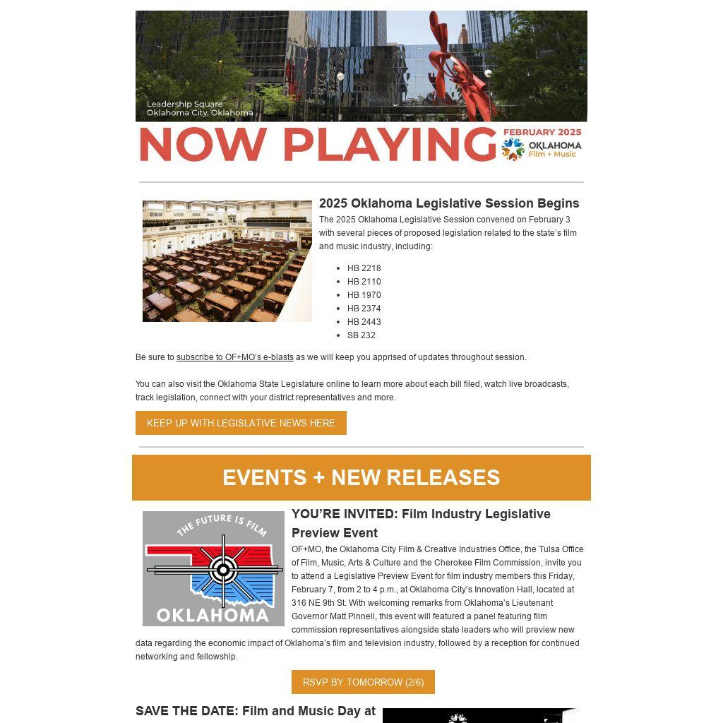 2025 Oklahoma Legislative Session Begins The 2025 Oklahoma Legislative Session convened on February 3 with several pieces of proposed legislation related to the state’s film and music industry, including: