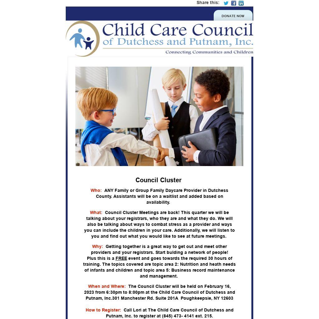 When and Where: The Council Cluster will be held on February 16, 2023 from 6:30pm to 8:00pm at the Child Care Council of Dutchess and Putnam, Inc.301 Manchester Rd. Suite 201A Poughkeepsie, NY 12603