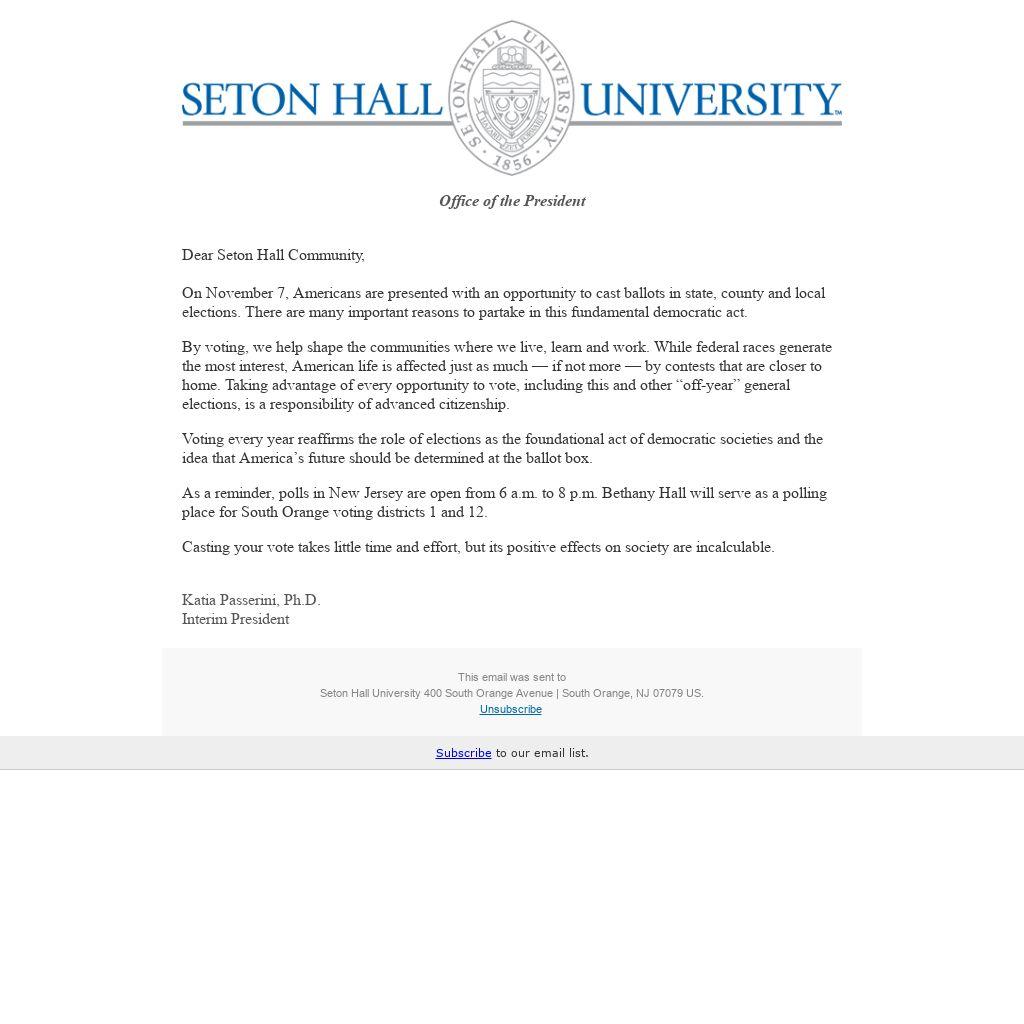 As a reminder, polls in New Jersey are open from 6 a.m. to 8 p.m. Bethany Hall will serve as a polling place for South Orange voting districts 1 and 12.