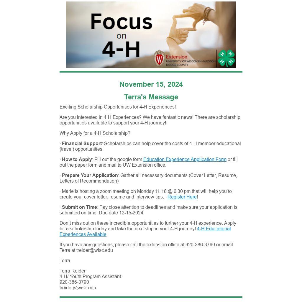 · Financial Support: Scholarships can help cover the costs of 4-H member educational (travel) opportunities.