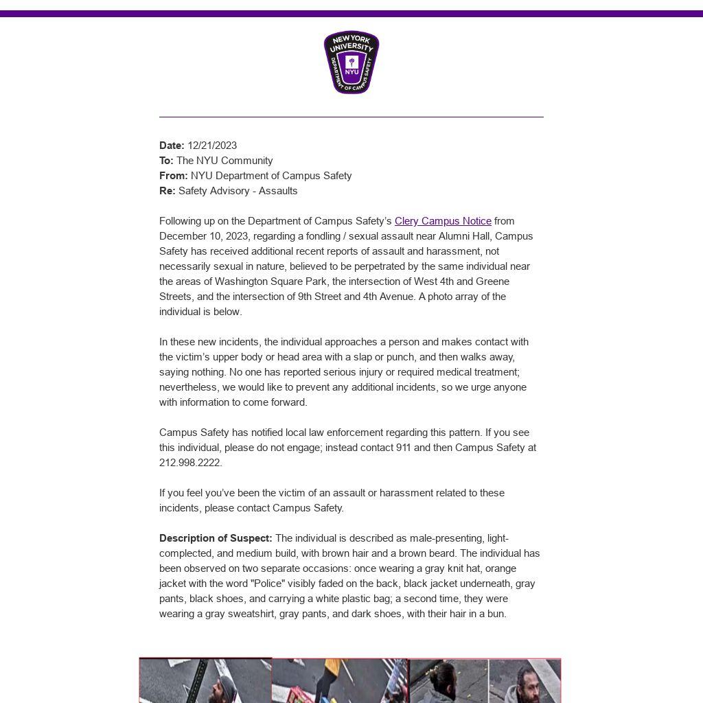 Clery Campus Notice from December 10, 2023, regarding a fondling / sexual assault near Alumni Hall, Campus Safety has received additional recent reports of assault and harassment, not necessarily sexual in nature, believed to be perpetrated by the same individual near the areas of Washington Square Park, the intersection of West 4th and Greene Streets, and the intersection of 9th Street and 4th Avenue. A photo array of the individual is below.