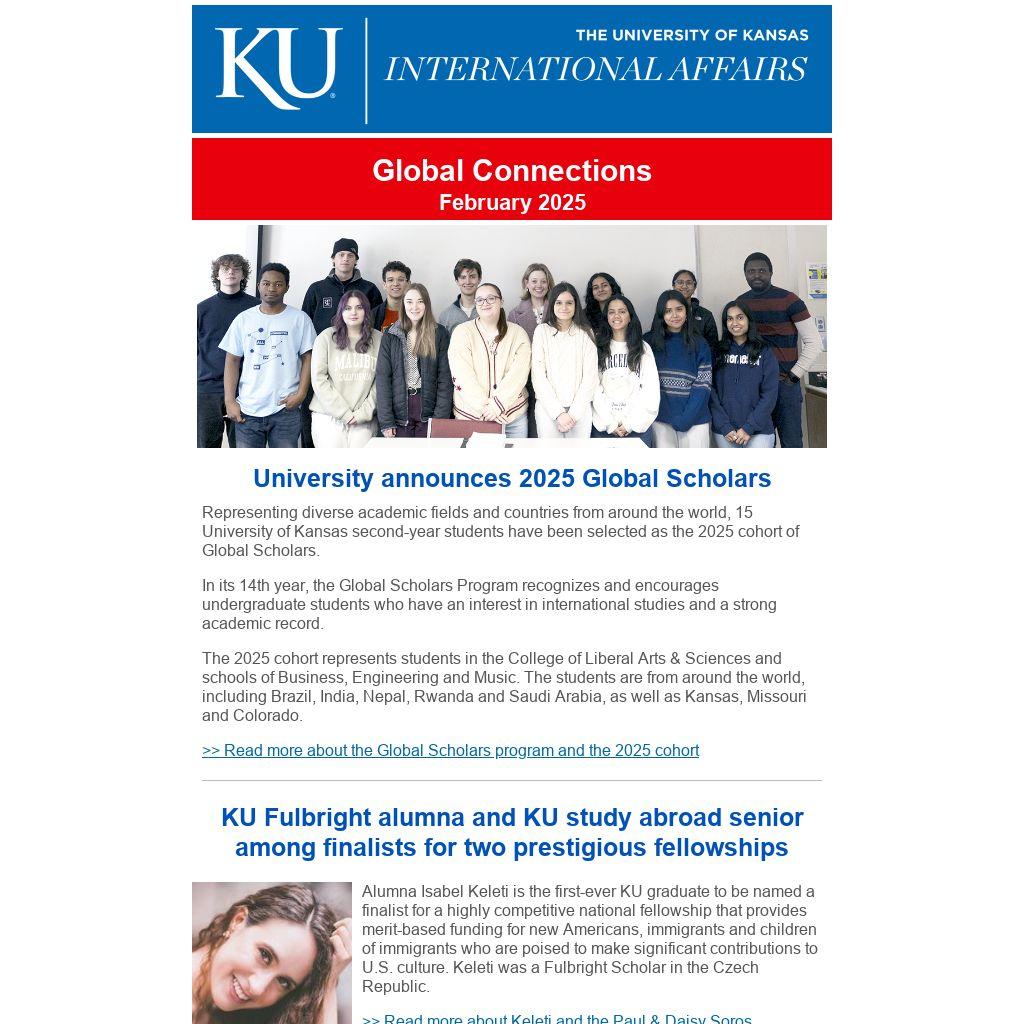 Representing diverse academic fields and countries from around the world, 15 University of Kansas second-year students have been selected as the 2025 cohort of Global Scholars.