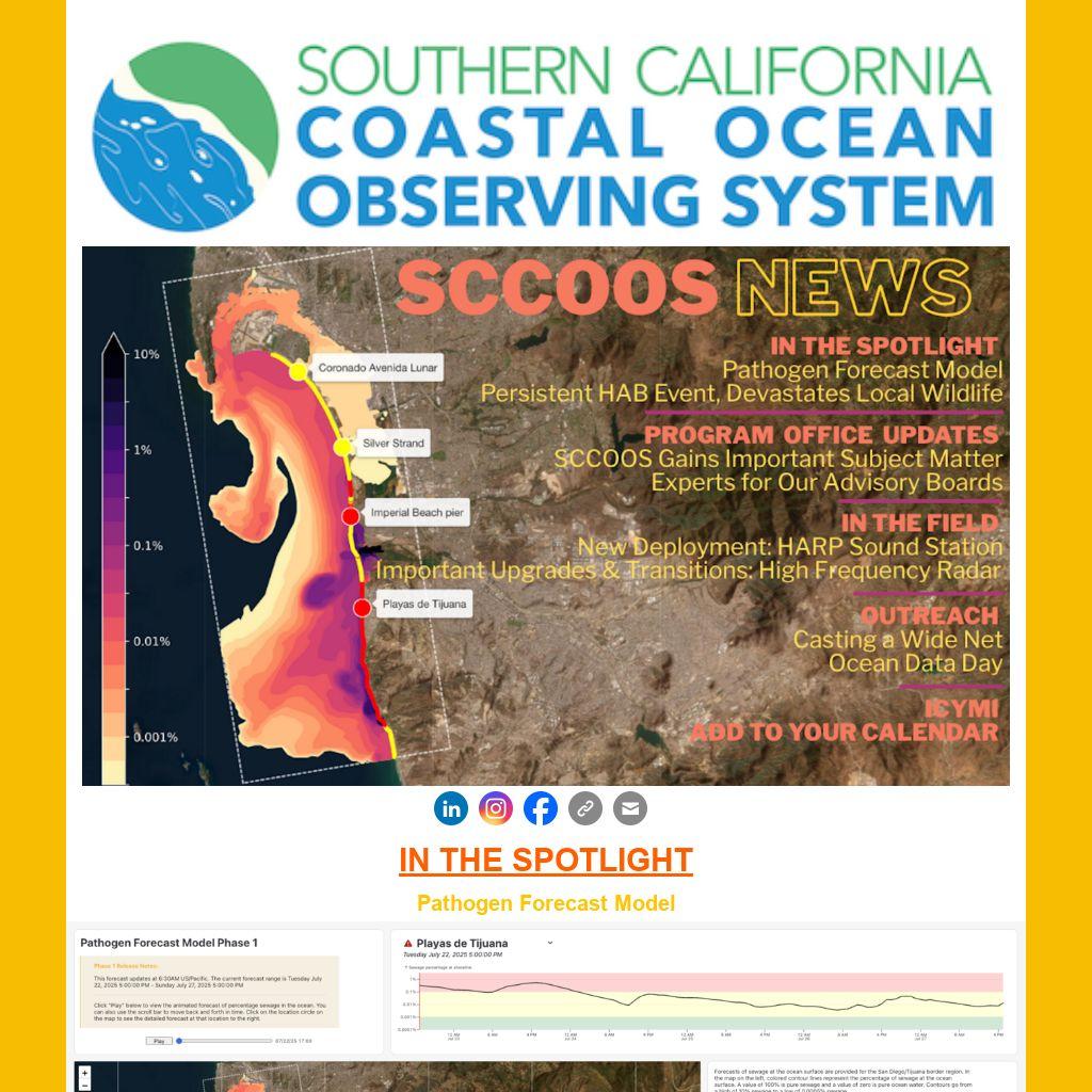 We are excited to share the launch of a new tool to help the public visualize contamination levels and potential risks of illness in the coastal ocean of the San Diego-Tijuana border region. The efforts were a result of a pollution transport experiment that began in 2015. It revealed how nearshore currents near Imperial Beach can transport pollution along the coast. In 2021, the transport experiment was coupled with known sewage sources, which resulted in the first iteration of a coastal ocean, pathogen, and human-illness model. Seeing the value in this work, the State of California awarded Scripps Institution of Oceanography $3 million in 2023 to further advance the pathogen forecast model to what we have today. There are plans to continue improvements, with a phase 2 starting summer of 2026. It will validate the forecast for improved swimmer illness risk - stay tuned.