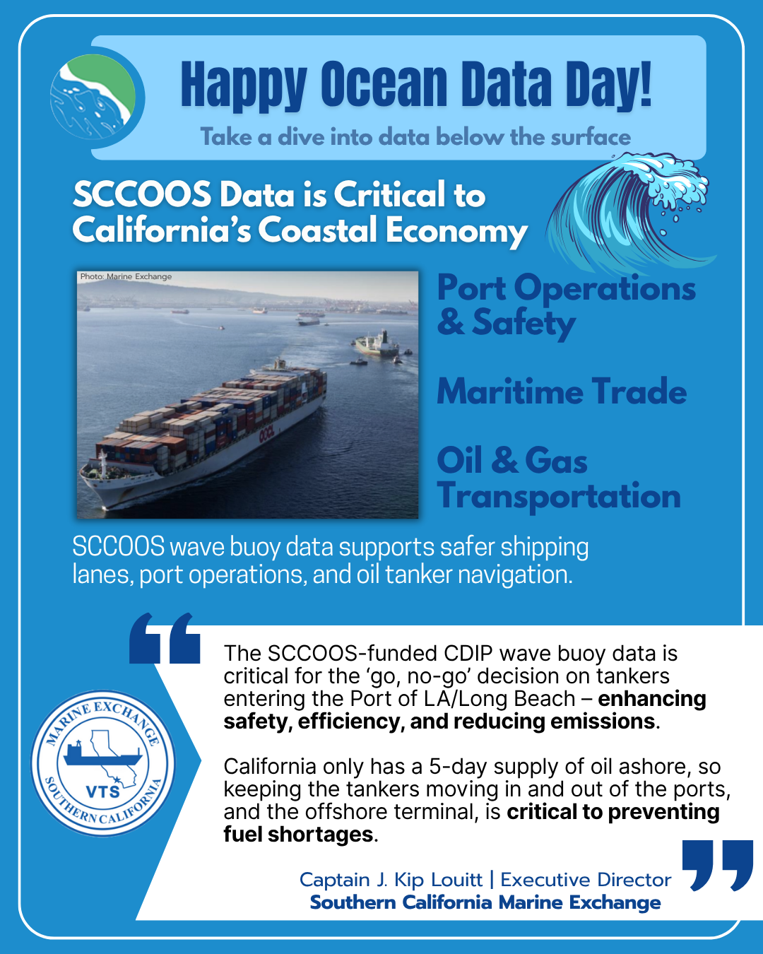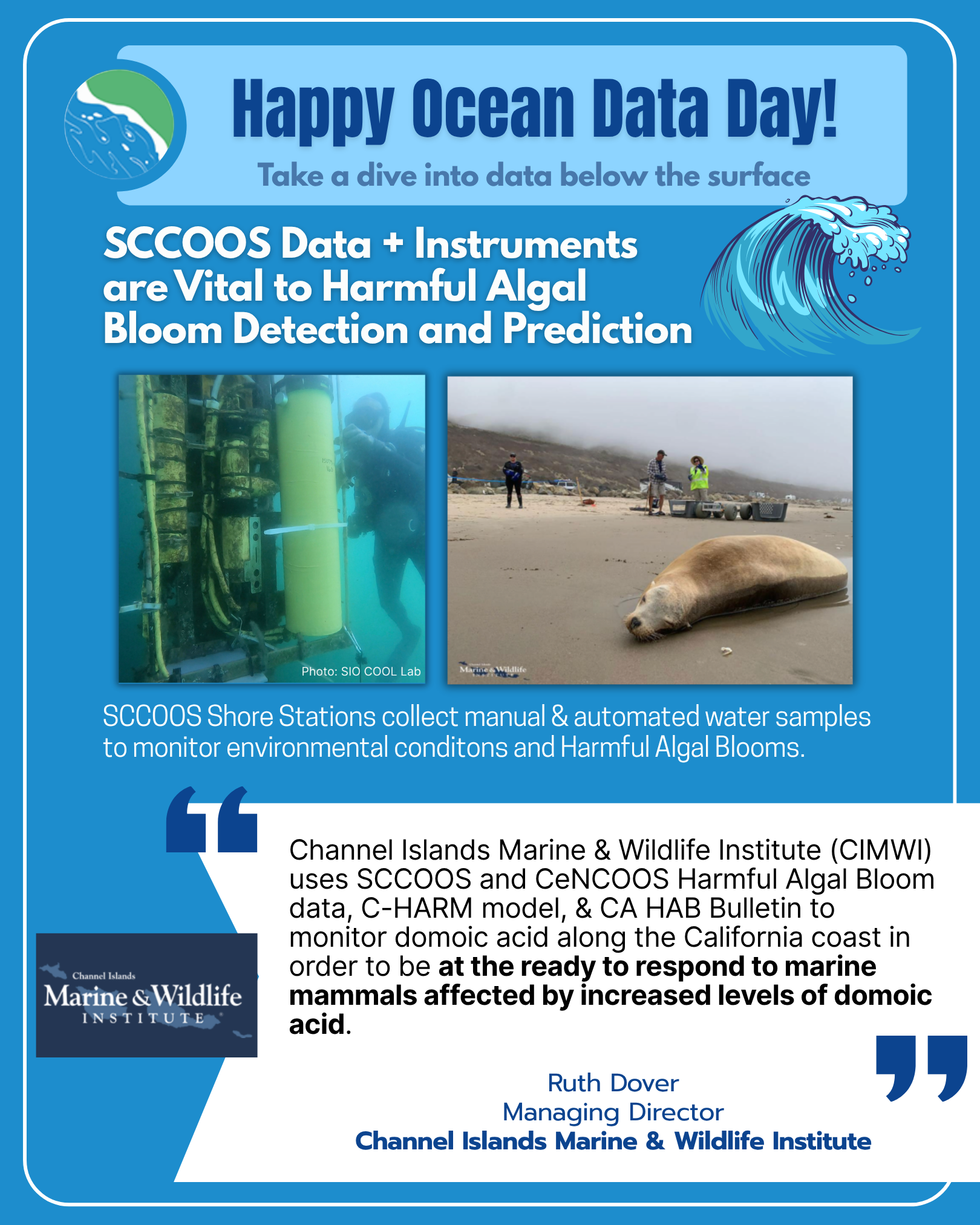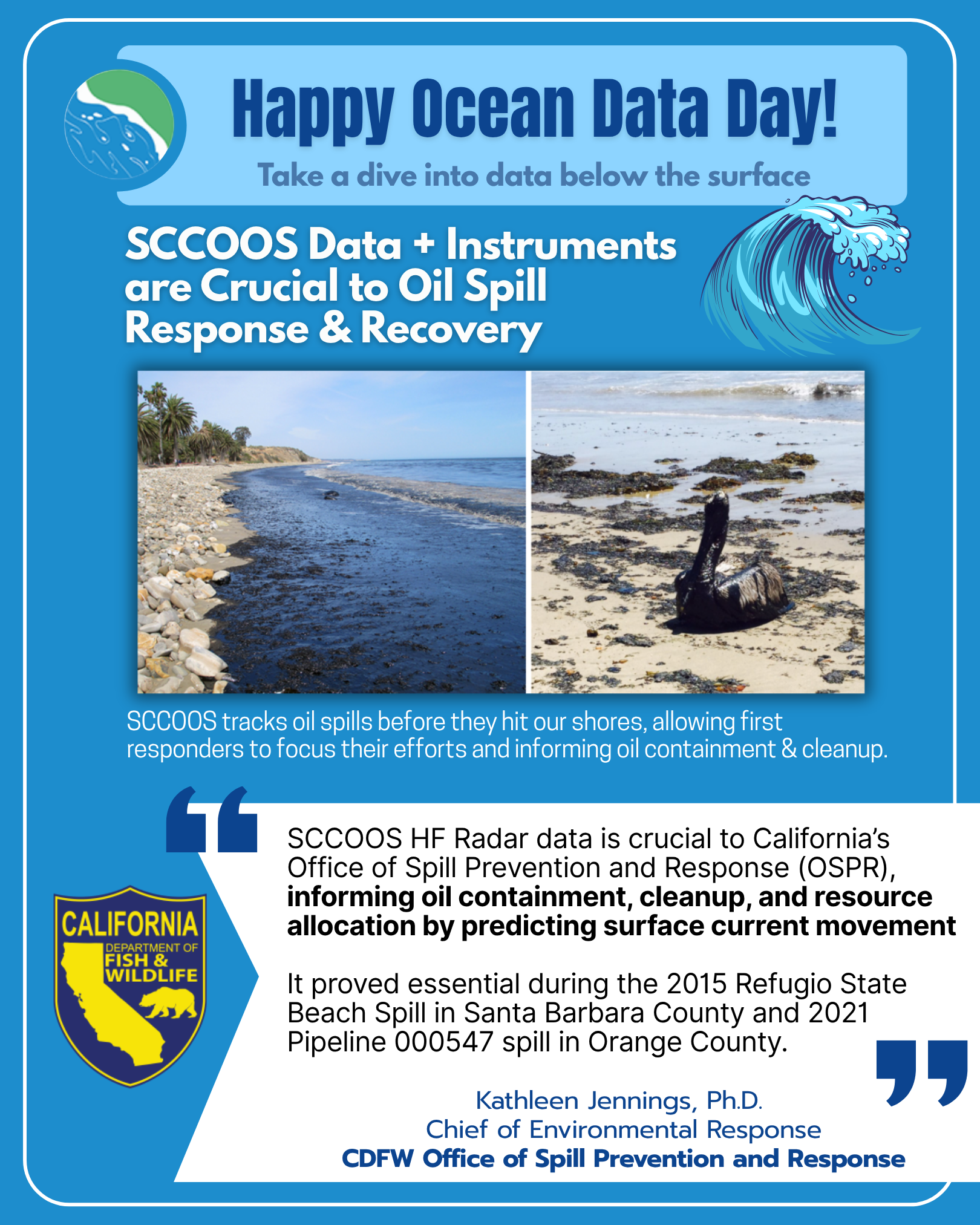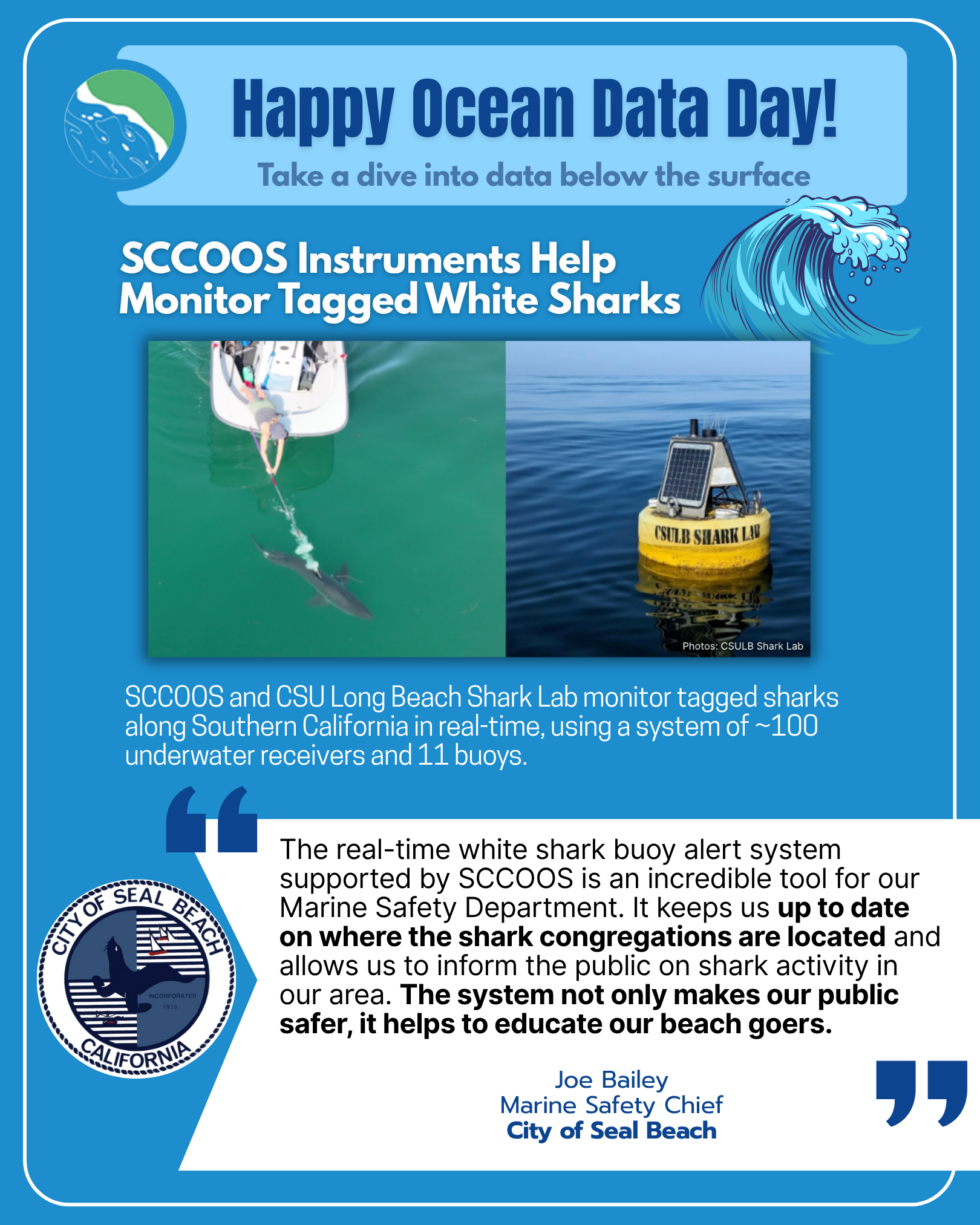 Alongside IOOS Association and the 11 regional associations of IOOS, SCCOOS celebrated Ocean Data Day. Leveraging a campaign led by Makenna Martin, SCCOOS’s outreach specialist, inviting the public to dive into the data below the surface - exploring the critical role ocean observing plays in business & commerce, research, and safety for everyone in the United States. Highlighting our involvement in Oil Spill Response and Recovery, Port Operations, Search & Rescue, Sharks, Border Water Quality, and Harmful Algal Bloom Monitoring.