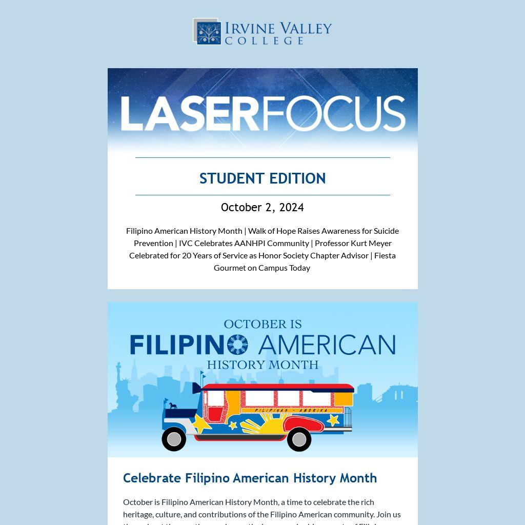 Filipino American History Month | Walk of Hope Raises Awareness for Suicide Prevention | IVC Celebrates AANHPI Community | Professor Kurt Meyer Celebrated for 20 Years of Service as Honor Society Chapter Advisor | Fiesta Gourmet on Campus Today