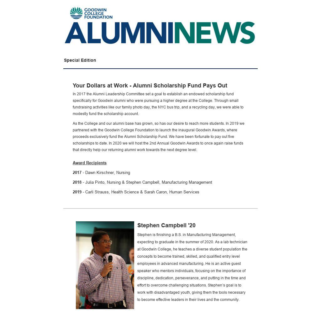 As the College and our alumni base has grown, so has our desire to reach more students. In 2019 we partnered with the Goodwin College Foundation to launch the inaugural Goodwin Awards, where proceeds exclusively fund the Alumni Scholarship Fund. We have been fortunate to pay out five scholarships to date. In 2020 we will host the 2nd Annual Goodwin Awards to once again raise funds that directly help our returning alumni work towards the next degree level.