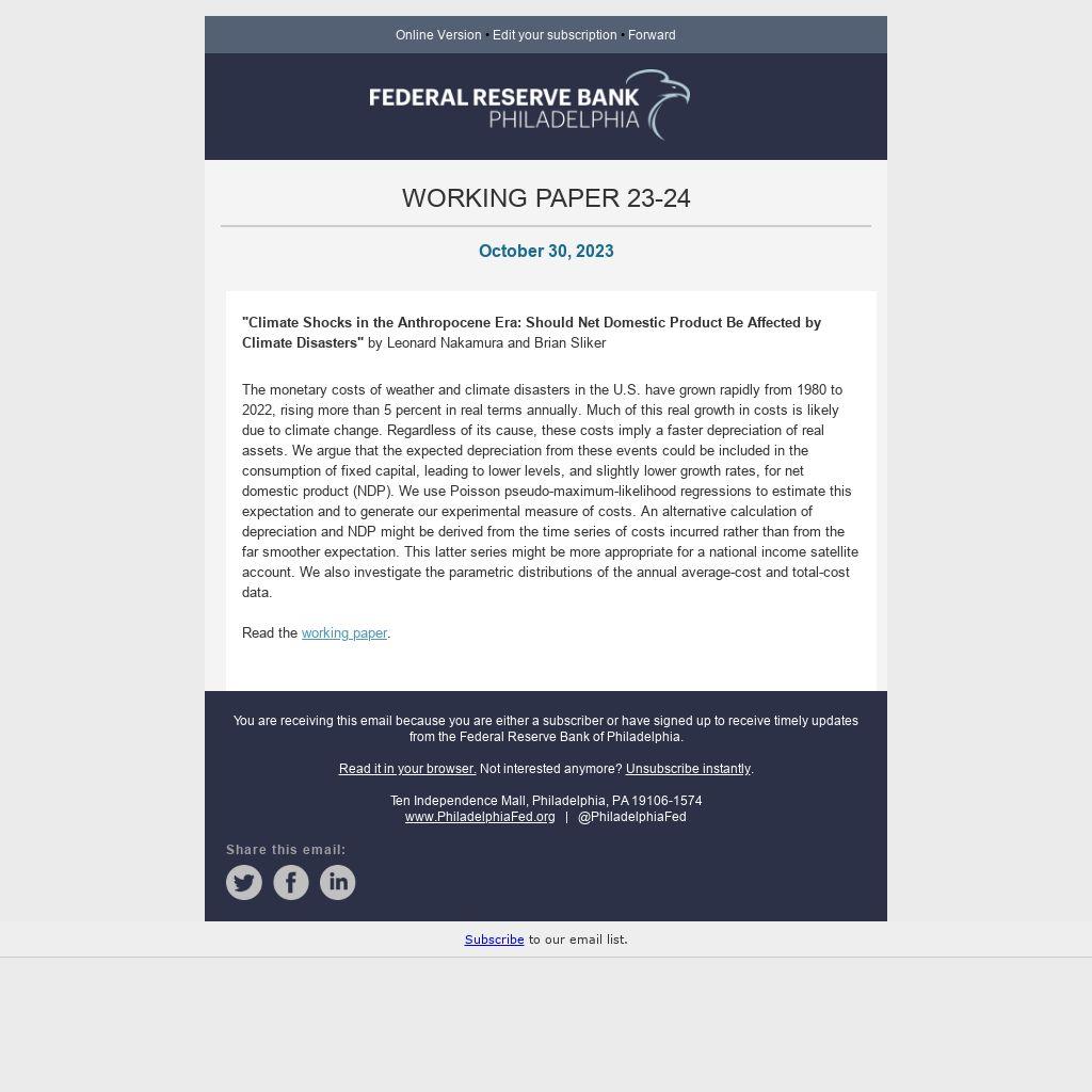 "Climate Shocks in the Anthropocene Era: Should Net Domestic Product Be Affected by Climate Disasters" by Leonard Nakamura and Brian Sliker