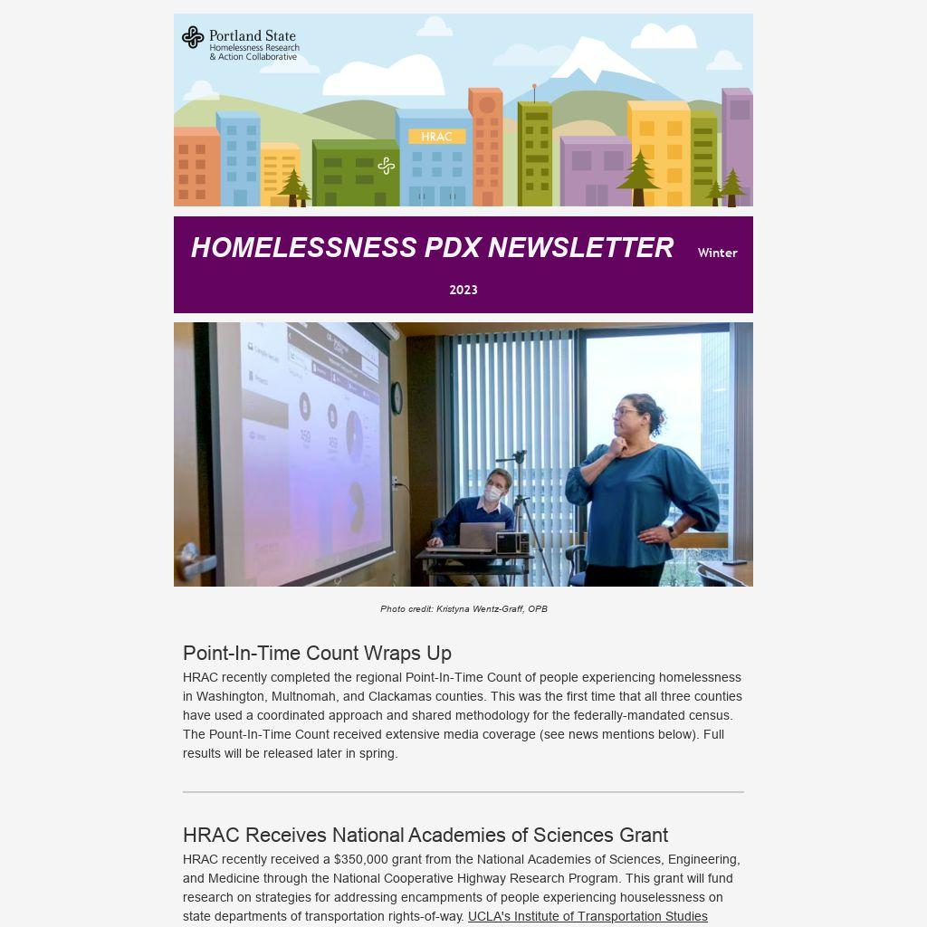 HRAC recently completed the regional Point-In-Time Count of people experiencing homelessness in Washington, Multnomah, and Clackamas counties. This was the first time that all three counties have used a coordinated approach and shared methodology for the federally-mandated census. The Pount-In-Time Count received extensive media coverage (see news mentions below). Full results will be released later in spring.