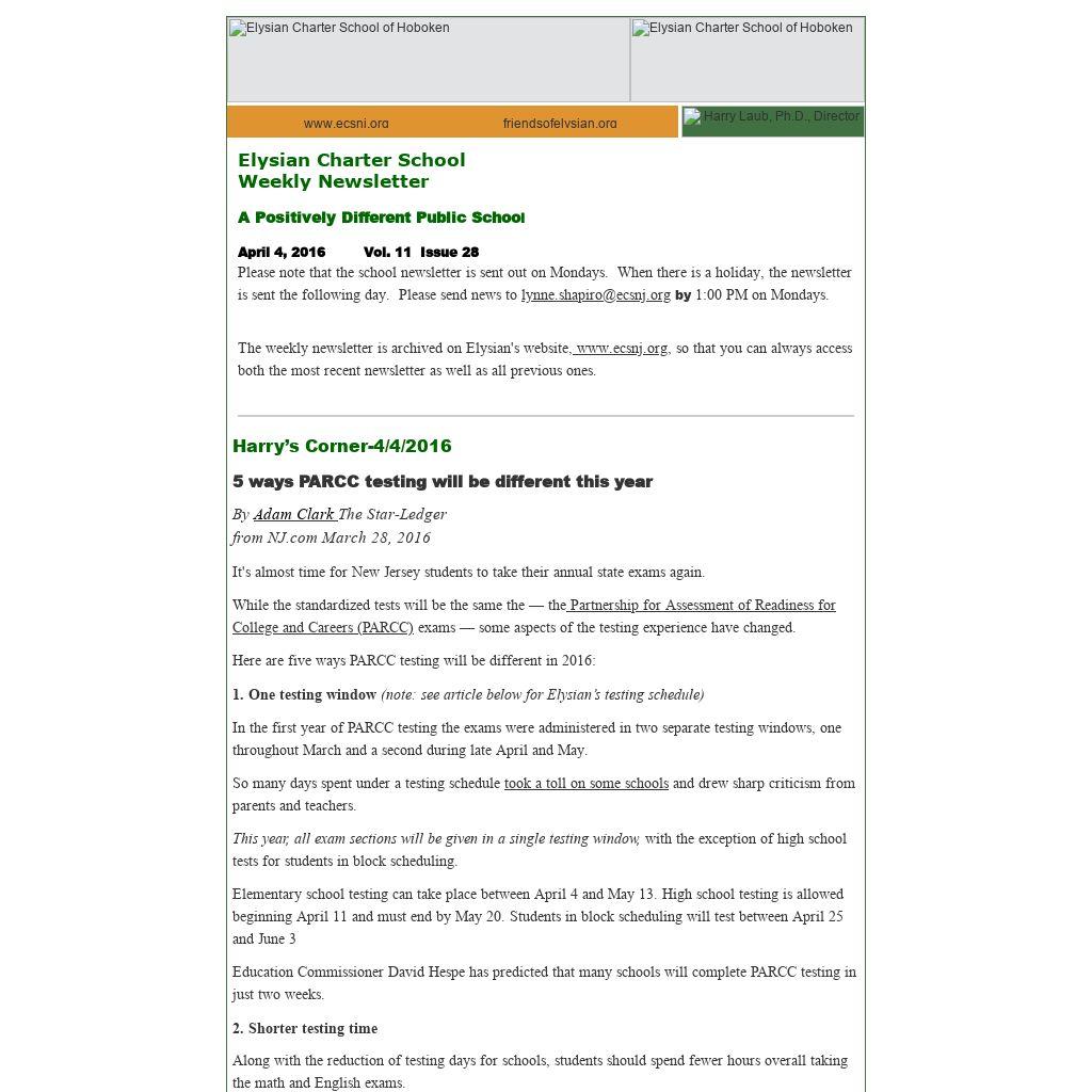 The weekly newsletter is archived on Elysian's website, www.ecsnj.org, so that you can always access both the most recent newsletter as well as all previous ones.