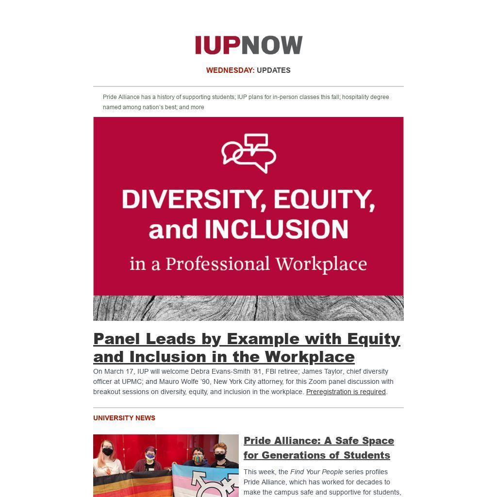 Distributed to IUP employees and students four days a week, IUP Now is the official newsletter of Indiana University of Pennsylvania. It features news from across the IUP website, compiled by the Division of Marketing and Communications. Find out how to get your news and events in IUP Now.