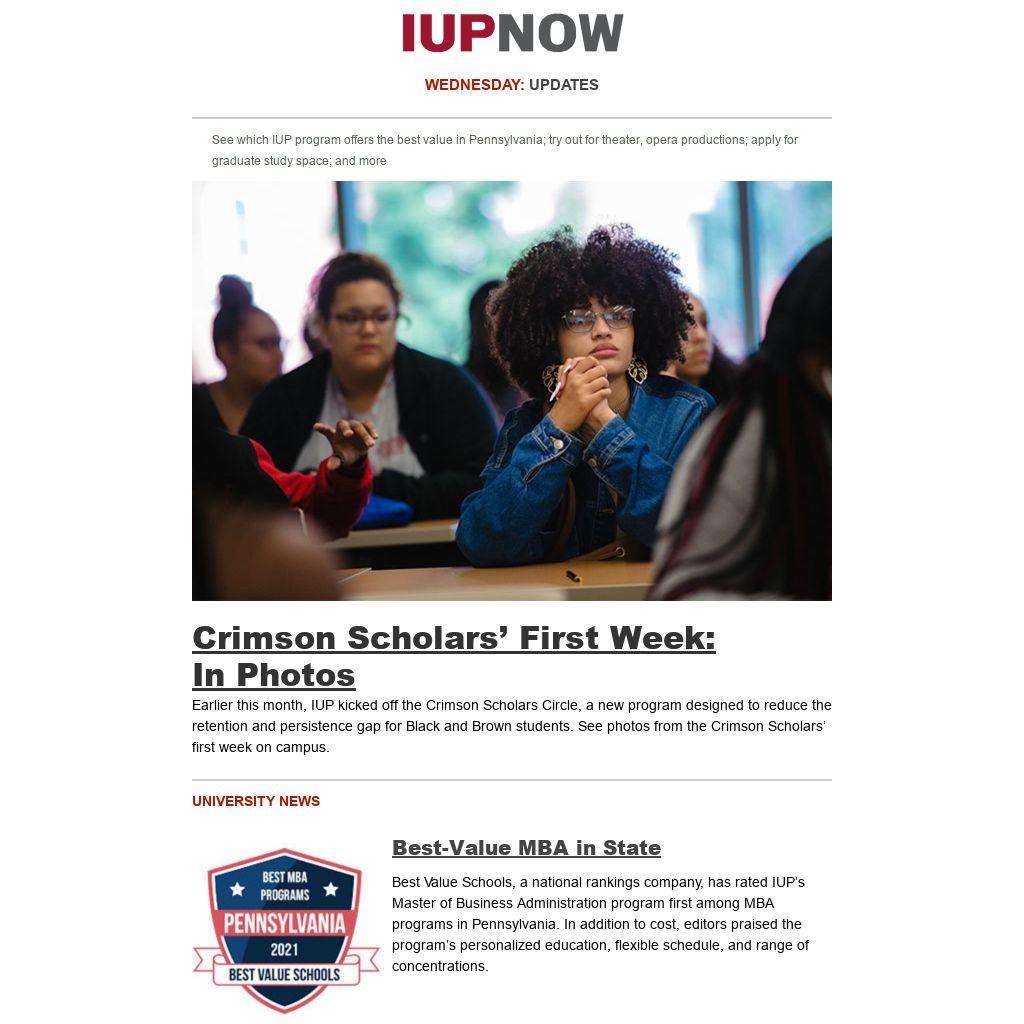 Distributed to IUP employees and students three days a week, IUP Now is the official newsletter of Indiana University of Pennsylvania. It features news from across the IUP website, compiled by the Division of Marketing and Communications. Find out how to get your news and events in IUP Now.