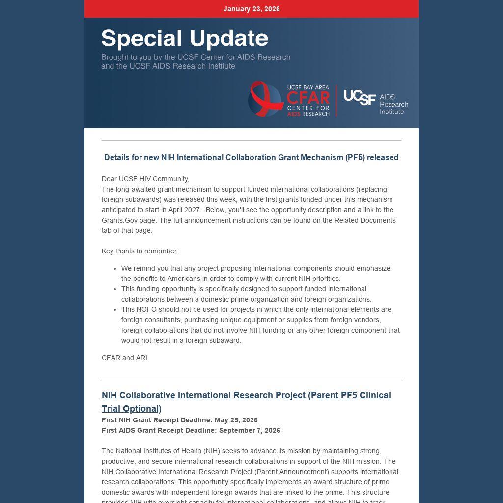 The National Institutes of Health (NIH) seeks to advance its mission by maintaining strong, productive, and secure international research collaborations in support of the NIH mission. The NIH Collaborative International Research Project (Parent Announcement) supports international research collaborations. This opportunity specifically implements an award structure of prime domestic awards with independent foreign awards that are linked to the prime. This structure provides NIH with oversight capacity for international collaborations, and allows NIH to track international funding, as identified in NOT-OD-25-104. This funding opportunity is specifically designed for NIH to support funded international collaborations between a domestic prime organization and foreign organizations. This NOFO should not be used for foreign consultants, purchasing unique equipment or supplies from foreign vendors, foreign collaborations that do not involve NIH funding or any other foreign component that would not result in a foreign subaward. All collaborative international research project applications must include at least 1 international subproject. The proposed project must be related to the programmatic interests of one or more of the participating NIH Institutes, Centers and Offices (ICOs) based on their scientific missions. The application will be evaluated as a whole, and the international subproject(s) will be evaluated on whether the project presents special opportunities for furthering research programs through the use of unusual talent, resources, populations, or environmental conditions in other countries that are not readily available in the United States or that augment existing United States resources, and whether the proposed project has specific relevance to the mission and objectives of the ICO and has the potential for significantly advancing the health sciences in the United States.