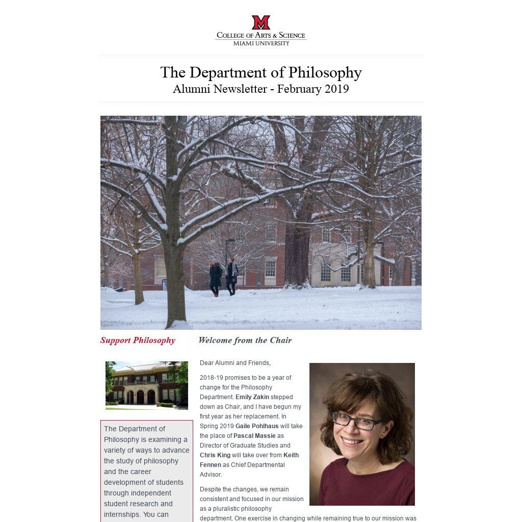 We aim to make familiarizing majors with these threshold concepts and deepening their understanding of them a repeated part of their study over four years. To this end, faculty met in a series of three pedagogy workshops throughout the Fall 2018 semester to reflect about best teaching and assignment creation practices, as well as to consider our curricular offerings in relation to meeting our goals. This year also proved to be one of much international travel for our faculty, as we were invited or applied to international conferences and workshops worldwide, continuing to spread Miami's name as a center for continental philosophy, feminist philosophy, and ethics. Faculty traveled to conferences or consulting work in Austria, Australia, Brazil, China, Germany, and Spain. In addition, Philosophy is again central to the Altman program. Emily Zakin co-leads this year's program on "Truth and Lies,” an extremely timely topic in the age of allegations of “fake news” and “alternative facts,” which have, as the fellows state, “unsettled the sense of a shared reality that seems essential to democracy.” Faculty, students, alumni and the broader public participate in this yearlong inquiry into the importance of respecting divergent rules of communication while also resisting deception. Visiting speakers to date have included journalist Masha Gessen and artist Trevor Paglen. The department is also spearheading an effort to track the professions in which our majors end up making their careers. The sheer variety is notable: we have alumni who are lawyers, doctors, editors in publishing houses, business executives, and teachers. Every year we bring back alumni to talk about how their educational grounding in Philosophy has affected their success in their chosen career. We welcome any self-nominations to participate in this annual "Career Pathways" event." Finally, we hope to increase scholarship and independent research opportunities for our majors this year. As always, we would welcome your financial support, no matter how small, specifically with the goal of funding students for whom college tuition is a burden and in preparing philosophy majors for careers in the world beyond academia.