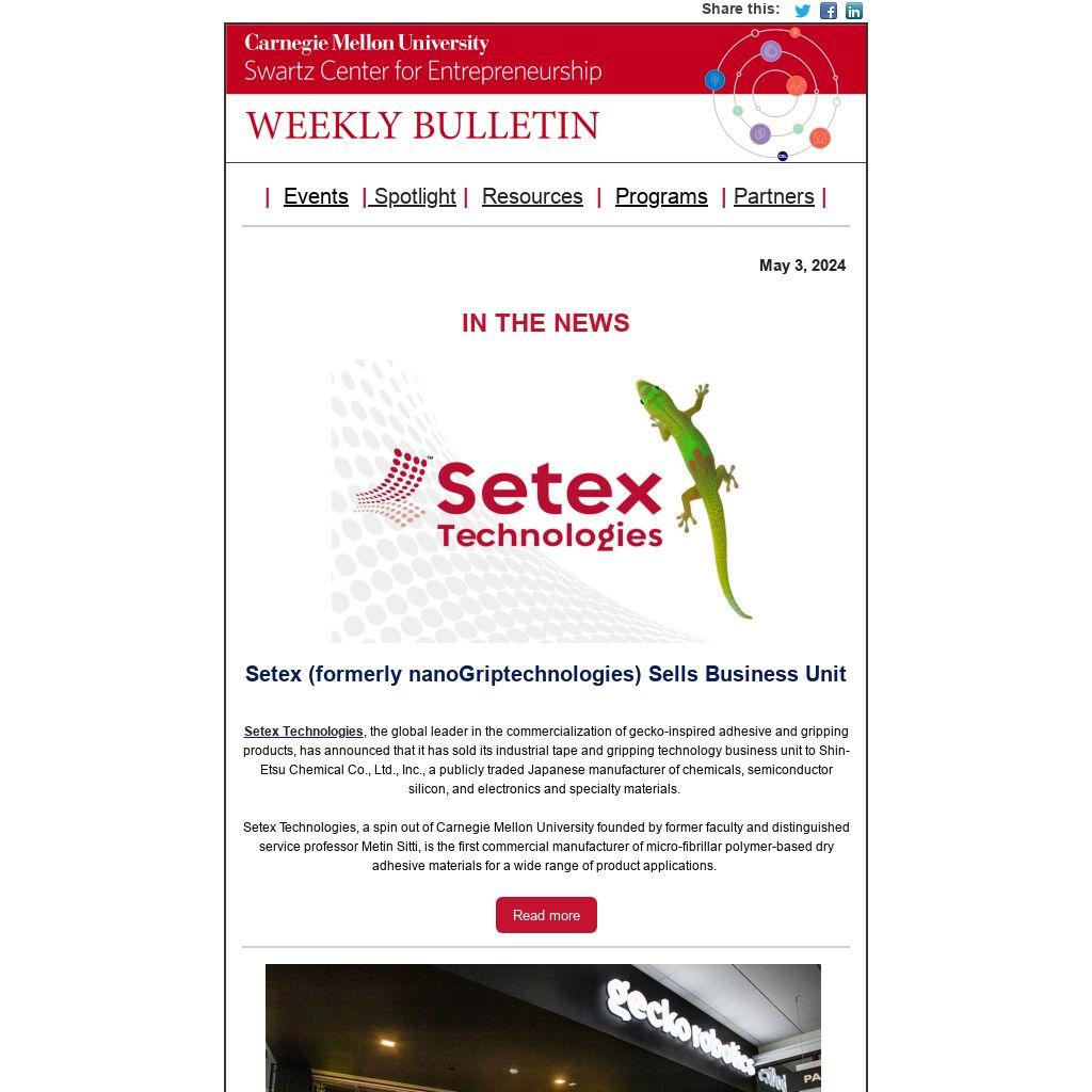 Setex Technologies, a spin out of Carnegie Mellon University founded by former faculty and distinguished service professor Metin Sitti, is the first commercial manufacturer of micro-fibrillar polymer-based dry adhesive materials for a wide range of product applications.