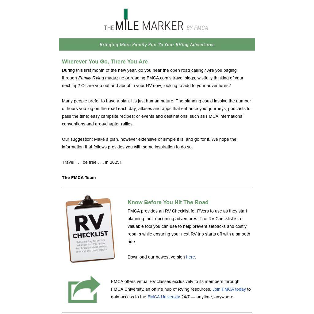 FMCA provides an RV Checklist for RVers to use as they start planning their upcoming adventures. The RV Checklist is a valuable tool you can use to help prevent setbacks and costly repairs while ensuring your next RV trip starts off with a smooth ride.